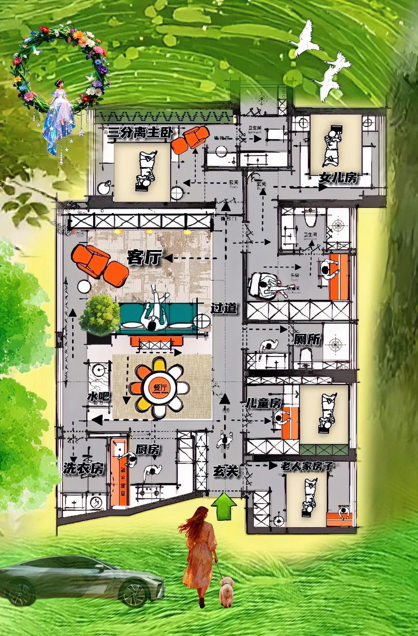 百看不厌的146㎡,却有180㎡天赋!布局清瘦,户型细长,大开间具象化了! 我知道,大家喜好敞亮,多个屋子,于是乎整个精致四居室,格局很文雅,展开一场180㎡魔幻上的邂逅! 客厅收服阳台,空间变得更加风趣点儿,玄关视野不压抑,餐厅更加完美,小水吧更吸引人,让九米九的横厅, 好空灵的感觉,功能多层次! 尤其是西南角的洗衣房,收藏140㎡的大小烦恼! 感觉在加点风声雨声声,就能变成我的半城! 永久的一蓑烟雨任平生! 我觉的面东的三卧室,位置排的很惬意啊 ,大概最明显,23㎡女儿房,双拼宅布局好美妙,小棉袄暖心的,被宠的,实现大多数家居的心理预期! 她,有单独的公主小城堡! 这一户设计素雅的很,横厅一条龙也好,公私区很搭配,最理性的三代同堂大平层! 叫做小中见大!