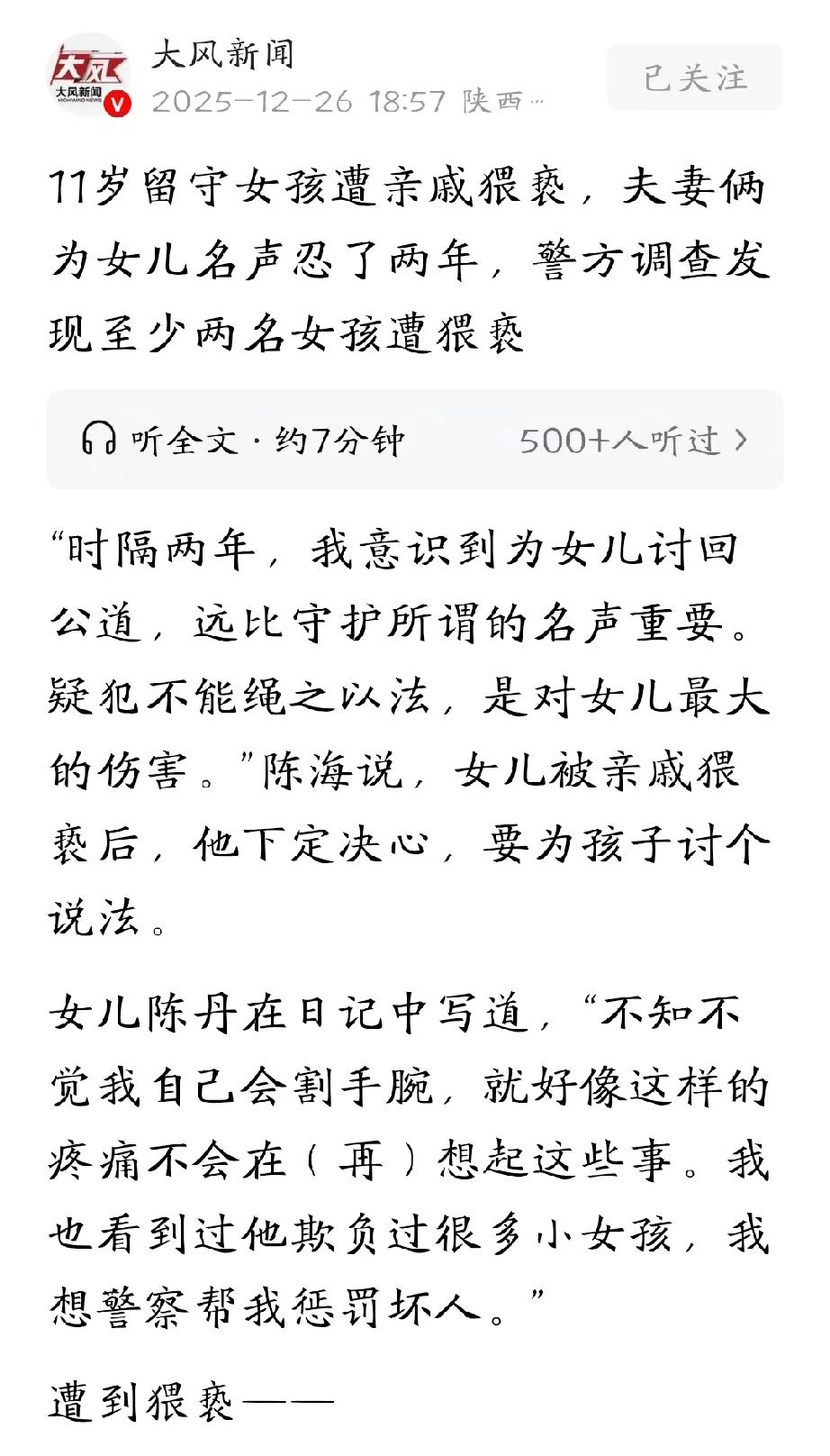 这就是留守女孩的悲哀!江西丰城,11岁留守女孩一人在家时,遭同村亲戚猥亵,爷爷奶奶怕丢人,坏了孩子的名声,不但没找对方算账,甚至不让孩子告诉父母。女孩身体实在不舒服,换上应急障碍,才将此事告诉了母亲,母亲如遭雷击,坚决要报警,谁知,却遭到丈夫殴打。丈夫因家暴入狱,狱中这才想明白:自己的沉默,才是对女儿最大的伤害。两年之后,这终于鼓起勇气将魏某告上法庭,谁知背后的真相,更让人触目惊心。 35岁的陈某为了养家糊口,不得不和妻子刘某背井离乡,常年在外打工,他们心里最放不下的,就是女儿小丹。 小丹2012年出生,正是需要家长陪伴和引导的时候,但为了生计没办法,他们只能把孩子留在老家,交给爷爷奶奶照顾。 就这样,小丹成了留守儿童,刚开始,日子平淡正常,但2023年8月,一次偶然的对话揭开了令人心碎的真相。 刘某好不容易回趟家,便带着女儿出去玩,谁知小丹突然说身体不舒服,非要让妈妈带她去医院。 刘某很疑惑,没听说孩子生病,于是,她再三追问家里的老人,老人这才才支支吾吾地说出了实情。 原来,不久前的一个晚上,孩子爷爷奶奶临时有事出去了,住在隔壁的亲戚魏某竟然来到家里,趁机猥亵了当时才11岁的小丹。 魏某是1988年出生,两家人是亲戚关系,平时走动很勤。 小丹将此事哭着告诉爷爷奶奶,谁知老人知道后,觉得这事太丢人,怕传出去坏了孩子的名声,不但没有找对方算账,还让小丹别告诉父母。 听到这个消息,刘某只觉得天旋地转,她感觉自己快要疯了。 她立刻带着女儿去医院检查,结果显示,孩子隐私部位有红肿充血,万幸的是,没有发生更严重的侵害。 很快,魏某家人打来电话,话里话外表示,就是愿意赔医药费,只求他们千万别报警。 小丹父亲陈某心里很挣扎,他首先想到的是丢人,觉得这事要是传出去,女儿以后还怎么做人?一辈子都得被人指指点点,抬不起头。 家里的长辈也劝他,家丑不可外扬,别为了这事坏了孩子的名声。 陈某被这些想法压住了,他希望妻子不要报警。 但作为母亲,刘某看着女儿一天比一天沉默,眼神越来越黯淡,心里像被刀子割一样。 过了一个星期左右,她实在受不了这种煎熬了,背着丈夫和家人,偷偷去报了警。 可是,因为陈某和其他家人都不愿意站出来作证,也不配合,警方当时没能刑事立案。 这件事成了夫妻俩之间争吵的导火索,而且越吵越凶,陈某甚至好几次对刘某动了手。 家庭暴力让刘某的精神渐渐垮了,而女儿小丹,变得更加孤僻,常常发呆,把自己整天关在屋子里。 《刑法》第260条规定:虐待家庭成员,情节恶劣的,处二年以下有期徒刑、拘役或者管制。 陈某因妻子报警与妻子反复争吵,并多次对刘某实施家暴,导致刘某精神崩溃,其行为属于持续性、经常性的家庭暴力,已达到“情节恶劣”的入罪标准。 所以,陈某最终被追究了刑事责任,进了监狱。 在监狱里的日子,他反复想着女儿的事,想着妻子的痛苦,想着自己的选择。出狱后,他才猛然惊醒:自己当初拼命想维护的那个所谓的名声,其实是对女儿最大的伤害。 真正的伤害,根本不是外人的闲言碎语,而是那个伤害女儿的罪犯还在外面逍遥快活,而作为父母,他们却选择了沉默。 两年时间了,这个家一直被那件事的阴影笼罩着。 2025年7月,陈某和刘某终于痛下决心,不再逃避,他们一起走进了派出所,坚决要为女儿讨个公道。 警方正式立案调查,这一查,真相更加触目惊心,原来魏某竟然是用零食引诱,多次猥亵小丹,而且,受害的孩子还不止小丹一个。 在民警的仔细调查下,另一个比小单大三岁的女孩也终于鼓起勇气,站出来指证了魏某的恶行。 经过专业鉴定,小丹被确诊患上了创伤后应激障碍,需要长期的心理治疗,才能慢慢重新建立对这个世界的信任。 2025年9月5日,魏某被公安机关依法逮捕,11月4日,案件被移送到检察院审查起诉。 检察院在办理过程中,了解到小单和另外那个受害女孩家庭的困难,主动为他们申请了8000元的国家司法救助。 目前,该案件即将提起公诉,那他将面临怎样的法律制裁呢? 《刑法》第237条第三款规定:猥亵儿童的,有下列情形之一的,处五年以上有期徒刑: (一)猥亵儿童多人或者多次的;(二)聚众猥亵儿童的,或者在公共场所当众猥亵儿童,情节恶劣的;(三)造成儿童伤害或者其他严重后果的;(四)猥亵手段恶劣或者有其他恶劣情节的。 本案中,魏某以零食引诱多次猥亵当时仅11岁的留守儿童小丹,且受害儿童不止一人,同时小丹被确诊创伤后应激障碍,需要长期心理治疗,已构成“猥亵儿童多人或多次”“造成儿童其他严重后果”两项法定加重情形。 魏某作为亲戚利用熟人身份与监护人临时缺位的机会作案,主观恶性明显,依法应在五年以上有期徒刑幅度内量刑。