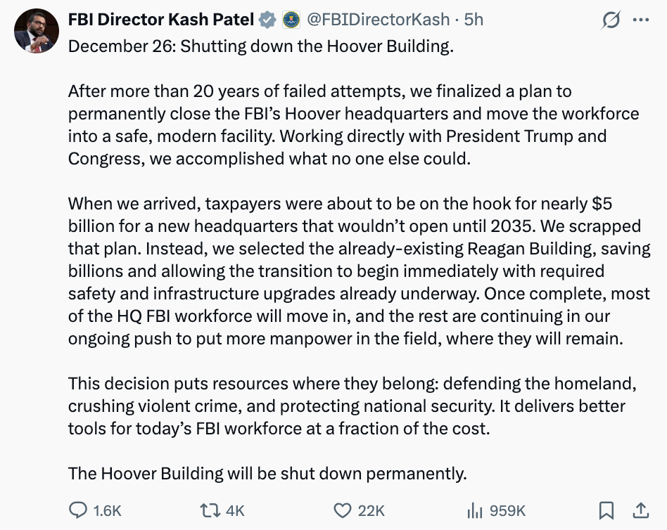 △联邦调查局长帕特尔在X平台发帖宣布,胡佛大楼将被永久关闭