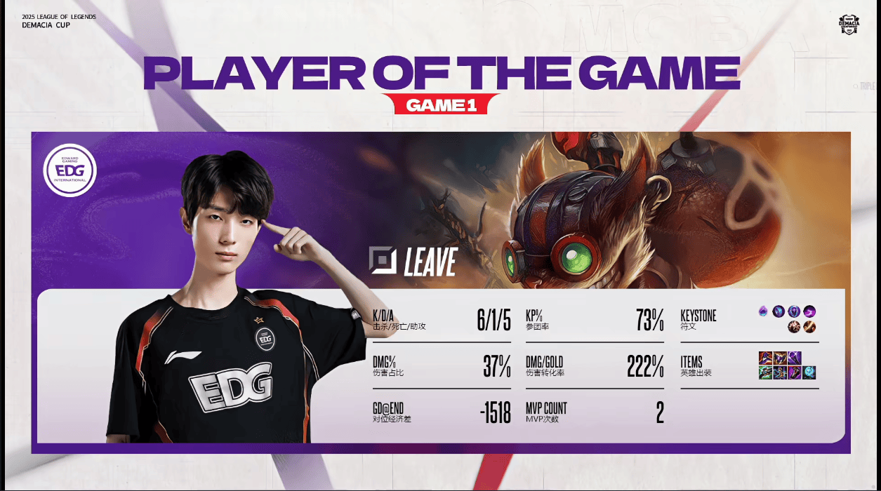 Leave炸弹人打出6/1/5战绩,斩获EDG对阵JDG第一局MVP