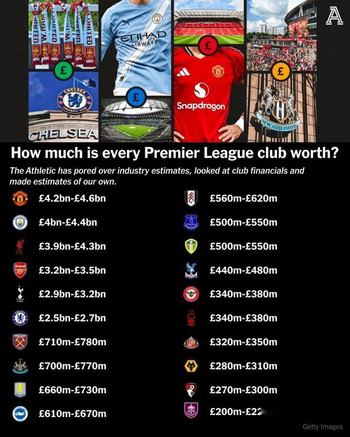 外媒预估英超20队的价值。 曼联42亿-46亿英镑。 曼城40亿-44亿英镑