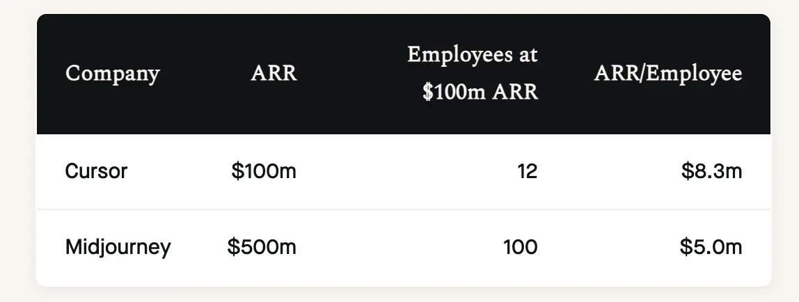 AI原生团队在商业效率上刷新了认知。Cursor在仅12名员工的情况下于2025年1月实现1亿美元ARR,Midjourney以约100人的团队实现5亿美元ARR。这种效率远超传统SaaS公司,证明了智能体软件在资本效率上的巨大优势。作为对比,Slack在达到1亿美元ARR时拥有650名员工,Ramp有275名,Wiz则有400名。