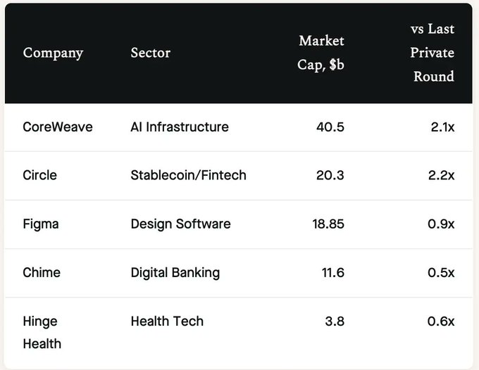 CoreWeave与Circle成功上市,市值表现和上市后交易情况强劲;与此同时,Figma、Chime等公司股价低于其上一轮私募估值,显示出公开市场对估值的判断更加理性。一些备受瞩目的公司如SpaceX、Stripe、Databricks并未在2025年完成上市,但为之后的年份积累了大量潜在动能。