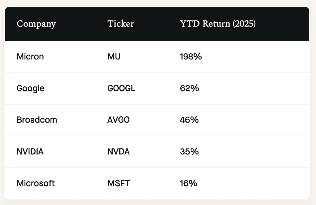 算力基础设施投资远超预期。2025年超大规模云厂商资本支出达到3150亿至3500亿美元,其中亚马逊约1000亿美元,微软约800亿美元,谷歌约750亿美元。半导体板块中,博通因AI网络建设需求股价大涨,在下半年表现甚至超过了英伟达,尽管全年涨幅在行业中位列第三,排在美光(Micron)和谷歌之后,但表现依旧亮眼。