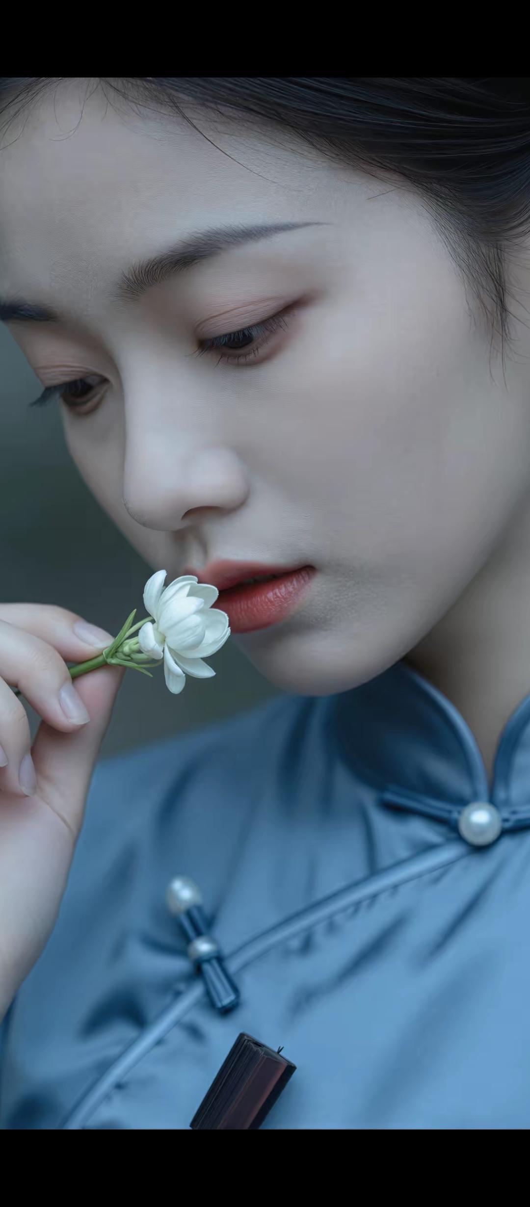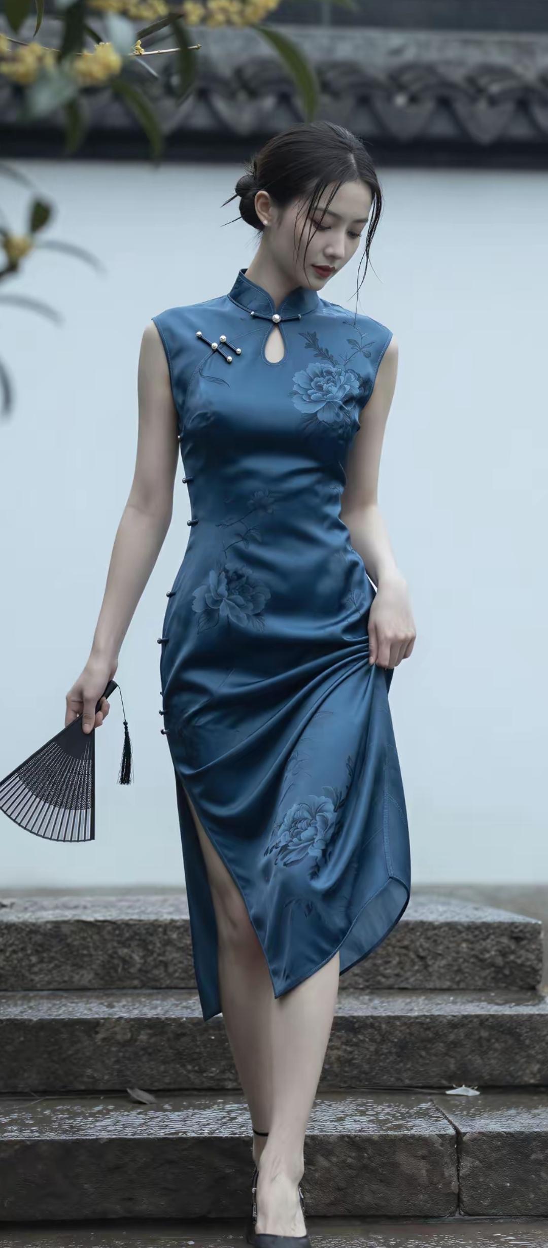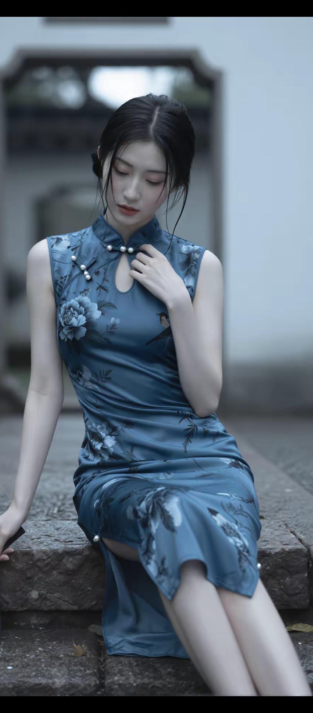 复古蓝旗袍,优雅坐石阶,韵味十足