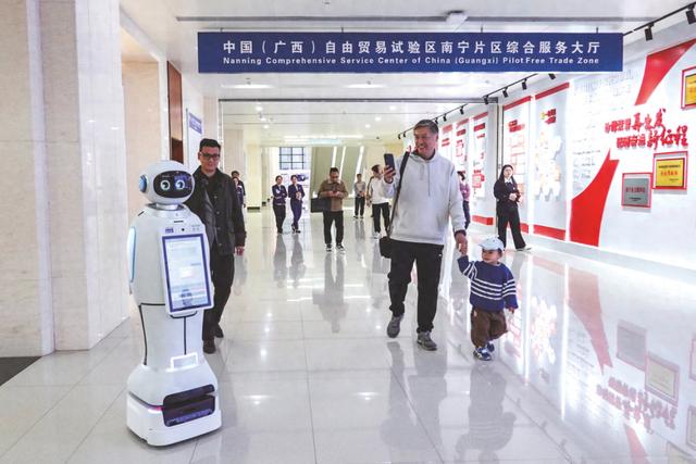 12月26日,在南宁市民中心,智能导办员“小邕”(AI机器人)为办事群众提供引导服务。记者叶子榕摄