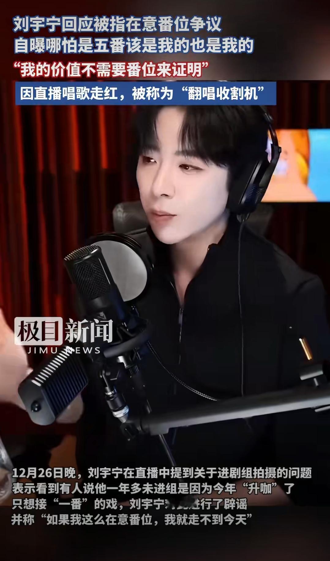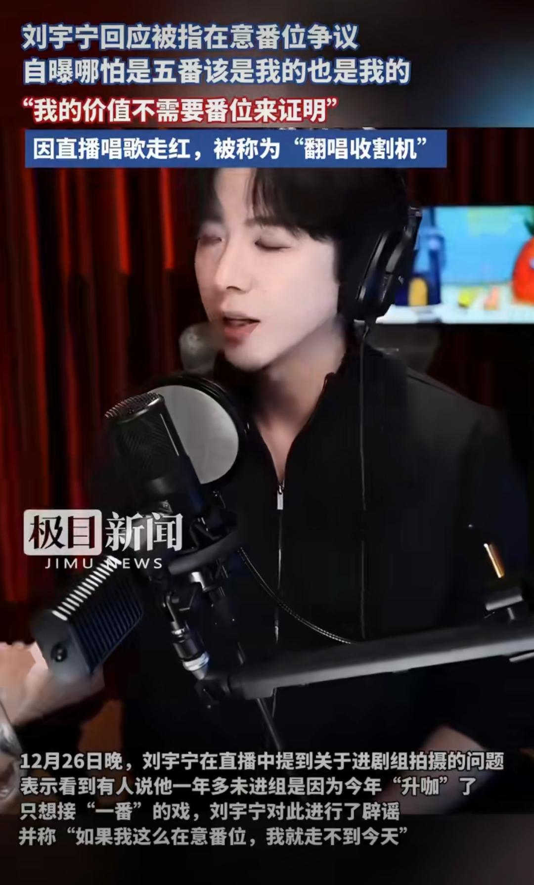 12月26日晚,刘宇宁直播回应“一年多没进组是因为只接一番”的说法,直接辟谣:“如果我这么在意番位,我就走不到今天。”他还自我打气:“我的价值不需要用番位来证明。”这话听着爽,其实更像他给自己的“职场清醒剂”。 而且人家这一年也没闲着:《折腰》《书卷一梦》播出成绩不错,综艺里《九万字》《座位》收藏量飞起。他还坦白:歌手看收藏,演员看热度,上《天赐的声音》本来目标就一个——破百万收藏就算赢,结果两首歌都爆了。粉丝也肉眼可见涨了不少。你看,实力一到,五番也能发光。