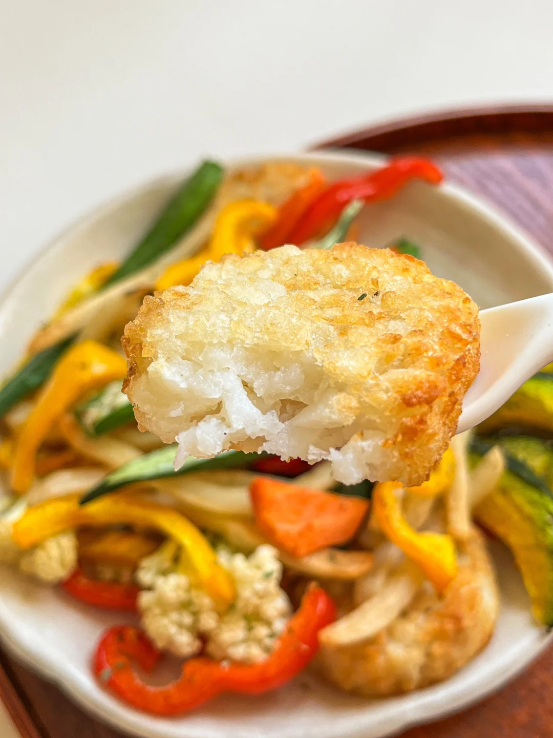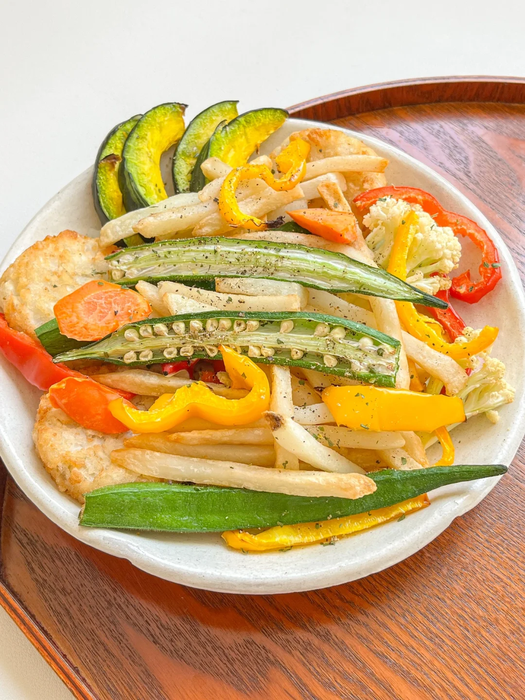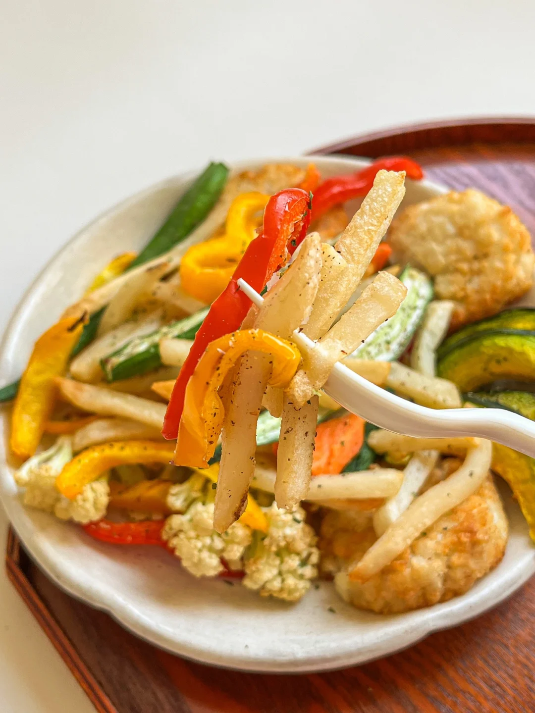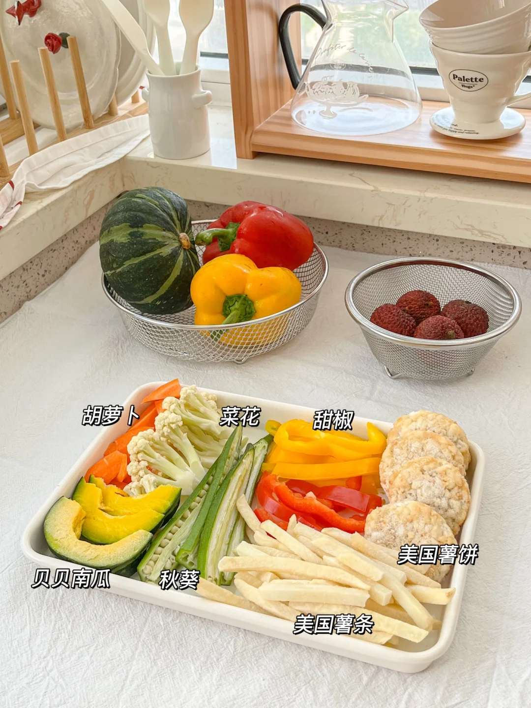 今天主食换换口味来吃马铃薯,当午餐的话可以搭配上丰富的蔬菜:花菜、胡萝卜、秋葵、甜椒和南瓜,就是一份简单又营养的轻食餐啦,做起来也很方便,用空气炸锅180度15分钟,出锅金黄、酥脆(外脆内绵),好吃又方便。再搭配上丰富的蔬菜一起,简单又营养~