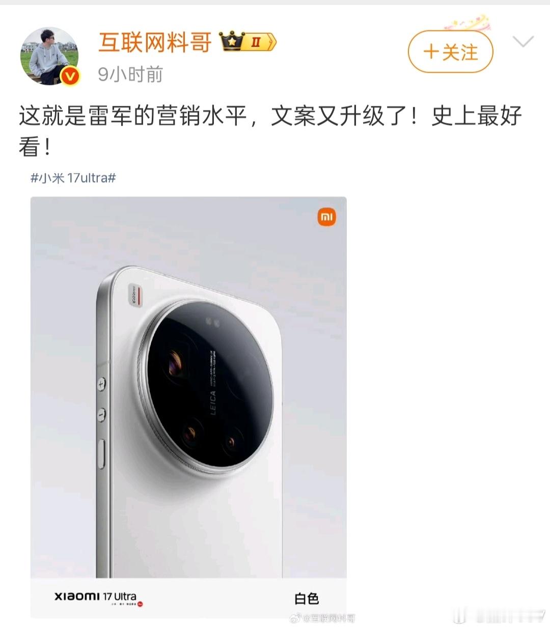 这人简直就是互联网的神棍,整体弄一些雷人的言论,我都不知道这对他有什么好处,雷军说小米17Ultra是史上最好看的小米手机,这有什么毛病吗?别动不动就说什么雷氏营销,做人还是得有点思考能力才行的,不然和咸鱼有什么区别!