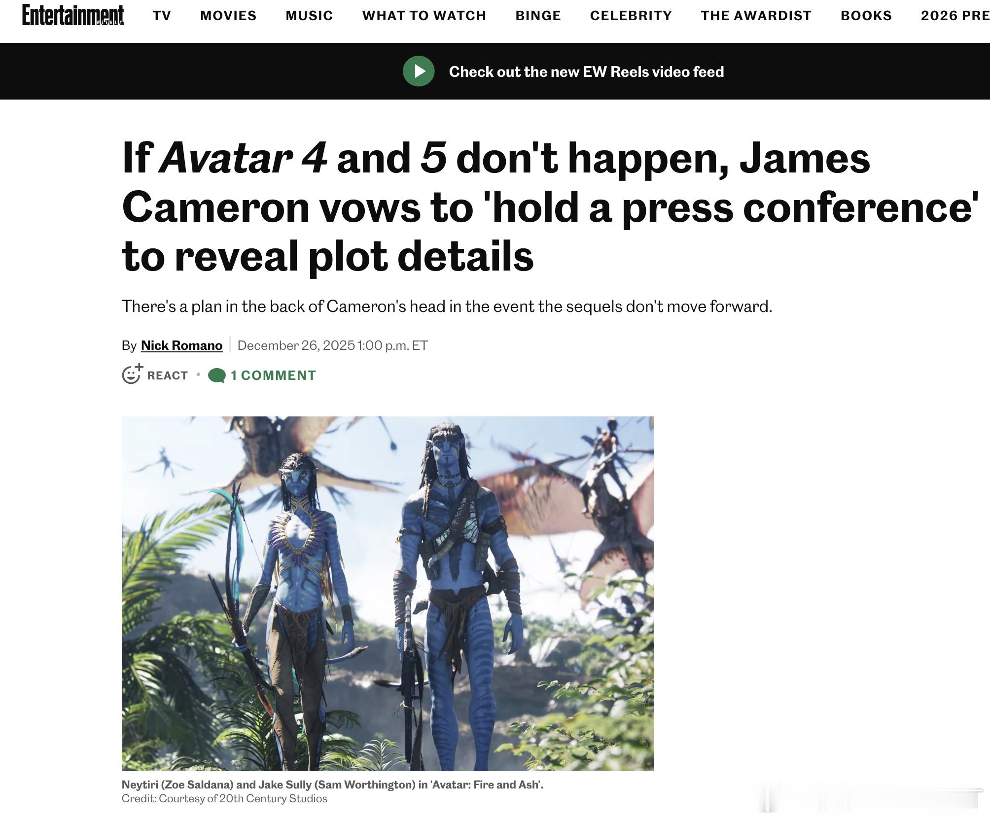 如果《阿凡达4》和《阿凡达5》未能制作,詹姆斯·卡梅隆誓言将“召开新闻发布会”披露剧情细节若续集无法推进,卡梅隆脑海中已有一套应对计划。作者:尼克·罗曼诺(Nick Romano)自《阿凡达:火与烬》(Avatar: Fire and Ash)新闻巡回宣传开启以来,编剧兼导演詹姆斯·卡梅隆出人意料地放缓了关于续集的讨论,尽管迪士尼此前已经为接下来的两部作品定下了上映日期。《阿凡达4》的一小部分内容已由卡梅隆及部分核心演员在制作第2、3部期间拍摄完成,目前定档于四年后的2029年。而《阿凡达5》则计划在2031年上映。“我不确定这一传奇系列(Saga)是否会延续到那个节点。我希望可以,”卡梅隆在12月初就此事告诉《娱乐周刊》(Entertainment Weekly)。“但是,你知道的,我们每次出击都必须证明其商业可行性。”如果事实证明续集最终无法推进——截至目前,《火与烬》上映仅一周全球票房已达4.833亿美元——这位三届奥斯卡奖得主也已准备好了计划。“计划是这样的,”他说道,“如果出于某种原因,我们没能拍成第4部和第5部,我会召开一场新闻发布会,告诉你们我们原本打算怎么做。这主意怎么样?”卡梅隆的另一个愿望是将《阿凡达》系列电影小说化,并由他亲笔撰写。他指出:“在这些已经创作完成的角色身上,有着极其深厚的文化、背景故事和侧向细节(lateral detail)。我很想做一些达到那种颗粒度细节水平(granular detail)的东西。”然而,他承认:“现在已经没有这种商业模式了。人们不再阅读了。”这位电影制作人所指的是一项由佛罗里达大学和伦敦大学学院的研究人员开展的新研究,该研究指出,出于兴趣而阅读的美国人数量下降了40%。“但无论如何,能有一份关于这一切本应所呈现的正典记录(canonical record),或许也是件好事,”卡梅隆补充道。
