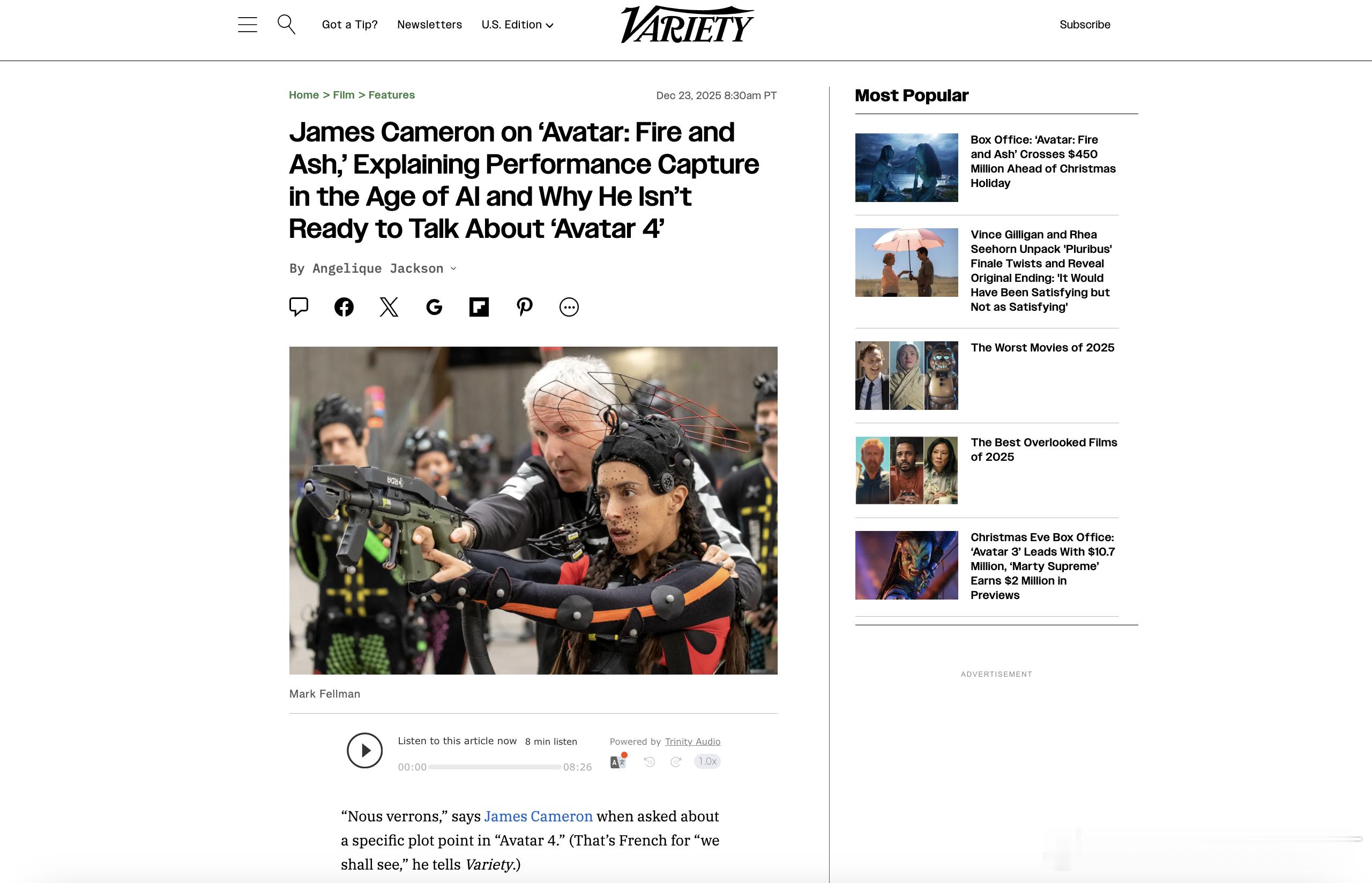 詹姆斯·卡梅隆谈《阿凡达:火与烬》:阐释 AI 时代的表演捕捉,以及为何他尚未准备好开启《阿凡达 4》的话题作者:安洁莉克·杰克逊(Angelique Jackson)“Nous verrons,”当被问及《阿凡达 4》中的某个具体情节时,詹姆斯·卡梅隆如此说道。(他告诉《综艺》,那是法语中“我们拭目以待”的意思。)这是《阿凡达:火与烬》全球首映礼后的第二天。轮到我在洛杉矶四季酒店与这位商业大片导演共处 10 分钟。为了这次媒体宣传活动,酒店的走廊和大堂已被改造成潘多拉星球的模样。(因此,人们或许会预料卡梅隆在采访中会蹦出几句纳威语,而不是法语。)但无论他说哪种语言,这位导演都明确表示,他并不急于讨论该系列的未来——至少,在票房收入统计完成之前是这样。“我们有点操之过急了,因为首先,我们得靠这一部赚到钱,”卡梅隆说。“每一次出击,我们都必须再次证明这个疯狂的商业案例。”“世界已经改变了。我们都知道那些统计数据,知道院线的现状。今年情况很糟,”他继续说道。“随着最近几部新片的上映,情况开始有所好转:‘《魔法坏女巫2》表现不错,《疯狂动物城2》也势头良好。所以,我们拭目以待。”卡梅隆并非谦虚,他是个现实主义者。他的《阿凡达》系列电影——讲述了由海军陆战队员转变为纳威人领袖的杰克·萨利(萨姆·沃辛顿 饰)、纳威战士奈蒂莉(佐伊·索尔达娜 饰)及其家人的冒险故事——背负着巨大的票房预期。2009 年的原作和 2022 年的续集《水之道》分别以 29 亿美元和 23 亿美元的成绩位列影史票房最高的两部电影。《火与烬》在首映周末全球斩获了强劲的 3.45 亿美元票房,但这一数字低于《水之道》的 4.35 亿美元开画成绩。正如《综艺》的丽贝卡·鲁宾在票房分析中所述,迪士尼斥资 3.5 亿美元制作了这部三部曲之作,并花费约 1.5 亿美元进行宣传。这意味着卡梅隆若要推进计划中的第四部和第五部,这部高预算大片必须在票房销售上交出满意的答卷。(据记录,《阿凡达 4》暂定于 2029 年 12 月上映,且该片的大部分内容已经拍摄完成,而《阿凡达 5》预计将于 2031 年 12 月亮相。)与此同时,《阿凡达》超级粉丝还可以欣赏幕后纪录片《火与水》,卡梅隆在其中揭秘了他那开创性的表演捕捉流程究竟是如何运作的。在此,卡梅隆反思了这部 Disney+ 纪录片如何改变了围绕表演捕捉的对话,尤其是在生成式人工智能时代;他还谈到了更多关于新片制作的点滴,比如引入奥娜·卓别林饰演的反派瓦琅,以及她与夸里奇(斯蒂芬·朗 饰)的关系原本打算拍得多么“火辣”。你曾说过在这些电影上映前总会感到有些紧张。现在感觉好点了吗?这是一个很好的第一步。人们的反响不错。在(首映礼)之前我还没和大量观众一起看过这部片子,因为我们之前做的是小型媒体放映会,我通常不参加那些。现场有一些笑声。那些笑声中有让你感到意外的吗?其中几处的笑声强度让我感到惊讶。然后现场也有掌声。有些时刻似乎让观众感到了相当大的宣泄感——是一些比较安静、情感充沛的桥段。对于那些戏份,我只需看看我的妻子苏茜;如果她正伸手拿纸巾,那我就知道那场戏奏效了。在大放映厅里,这种反馈很难察觉。全场为佐伊·索尔达娜饰演奈蒂莉的表演喝彩。你曾将她在《阿凡达》电影中的表现描述为“凶猛”,而且自我们上次谈话以来,她已经赢得了奥斯卡奖。你认为揭开表演捕捉技术运作的帷幕,是否有助于观众以不同的方式欣赏她的表演?这是一个非常棒的切入点。这正是我一直在做的事。我以前隐藏了表演捕捉的方法论,因为我觉得:“我不想看到人们穿着表演捕捉服。我希望他们认为角色是真实的。”对吧?但这对这些正在奉献职业生涯最佳表演的演员们来说实在是不公平。我有凯特·温丝莱特,奥斯卡得主;佐伊·索尔达娜去年赢得了奥斯卡;西格妮·韦弗,一位德高望重的女演员,多次获得提名。我只是想:“为什么我要把这些藏在斗底下?(出自圣经“把灯放在斗底下(Hide one's light under a bushel)”,意指刻意掩盖光芒或才华。)我应该赞美它。”我们只是把所有的电影制作艺术——所有的摄影机、镜头、灯光以及所有那些东西——统统推向未来。这就像黑匣子剧场或舞台排练。我的很多演员都演过戏剧,他们会说:“哦,这就像是在排演一出话剧。”那是种安静、亲密的探索。每个人都问:“在没有所有布景和服装的情况下,他们怎么可能演得出来?”实际上,演员生活在他们的想象力中,对吧?而我们提供他们需要的东西。西格妮说:“我真的很想有一件披肩之类的东西,我可以把它裹在身上,躲在后面,表现出那种愤世嫉俗且不被理解的青少年状态。”我说:“当然,没问题。”这是一个美妙的过程。作为创造了这些角色的编剧兼导演,把接力棒交给演员,然后看着他们如何演绎,没有什么比这更棒的了。我了解到西格妮——她在片中饰演萨利家领养的青少年女儿绮莉——实际上会为下一部担任旁白。情况可能是这样。我们有点操之过急了。奥娜·卓别林饰演的角色瓦琅,作为灰烬族(Ash people)的领袖,非常抢戏。但她与夸里奇的关系比一些人预期的更具性感色彩。存在一种双向的诱惑,但你有没有考虑过展示一段纳威人的性爱场面?我们从来没有拍摄过超出你所见内容的任何东西。就这么说吧。我们知道我们要追求的是一种感官上的潜流,而且