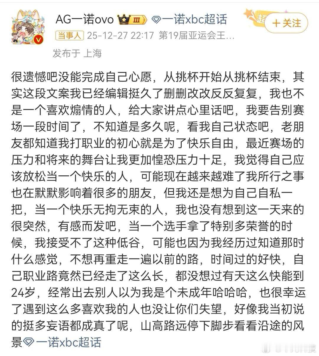一诺暂时告别赛场 啊?就挺突然的,AG一诺宣告暂时离开赛场,何时回归?要看自己的