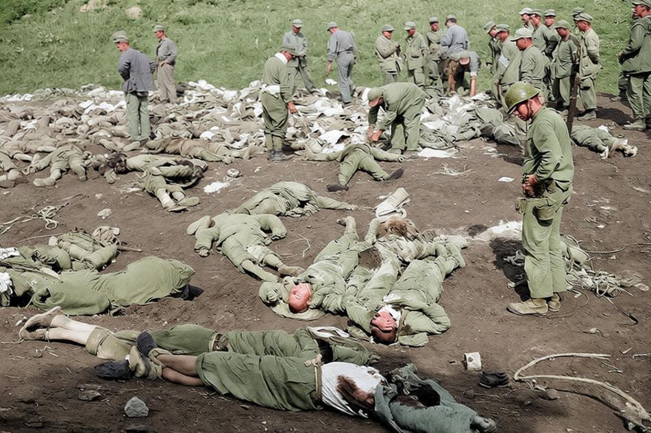 这张照片拍摄于1951年5月,春川地区战场上遍布阵亡的中国人民志愿军战士遗体。照片中,数十具志愿军战士遗体散布于山坡荒地,多数身着棉衣,姿势扭曲,现场有韩军或美军士兵在巡视、检查或清理。 志愿军在东线(包括春川—昭阳江)伤亡数万(美方估东线PVA/KPA总伤亡超7万),许多战士因弹尽粮绝、冻饿或炮火阵亡。联合国军称此为“May Massacre”(五月大屠杀),指志愿军巨大牺牲。此阶段志愿军虽重创韩军多个师,但整体进攻受挫,转入战略撤退,联合国军随即发起5—6月反攻。
