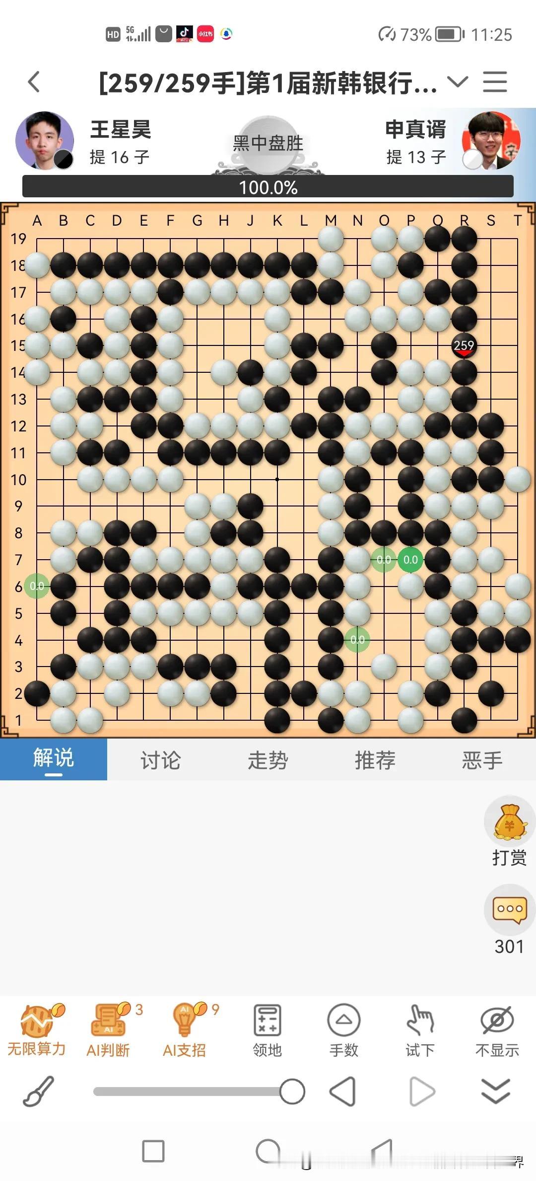 今天是个好日子,中国棋手党毅飞九段、王星昊九段在第一届新韩银行世界棋仙战上午的焦点战发挥出色,执黑击败申真谞、申旻埈九段,取得完胜! 王星昊九段与申真谞九段在网络平台对局可谓是知根知底,棋逢对手。此次下得非常精彩,黑棋一路直线追杀,白棋无奈断尾求生。然后黑棋完美控盘,任凭白棋想方设法反扑,依旧保持目数领先2~3目。观战的棋迷当时最担心的是王星昊超时或者裁判又来搞事情,毕竟王星昊的“昊”是“日”、“天”,而申真谞的谐音就是“肾正虚”啊,呵呵,赢了开心,希望王星昊、党毅飞九段再接再厉杀进决赛! 下午期待日本棋手一力辽九段、芝野虎丸的表现。南朝鲜棋院领导、承办方算盘打得哗哗响,通过用时、参赛选手名额来确保万无一失,甚至申真谞九段强势连杀李轩豪、丁浩两名高手,以为胜券在握,没想到党毅飞九段、王星昊九段如此神勇,完美复仇!