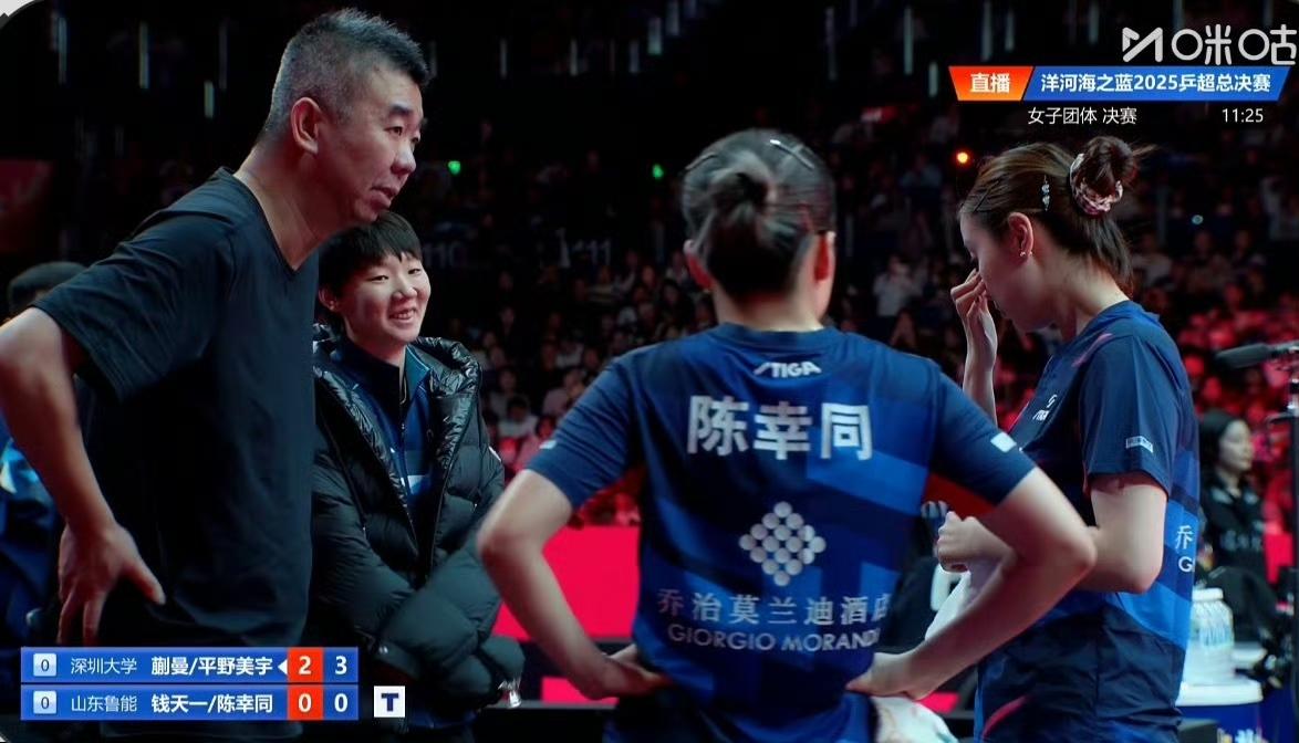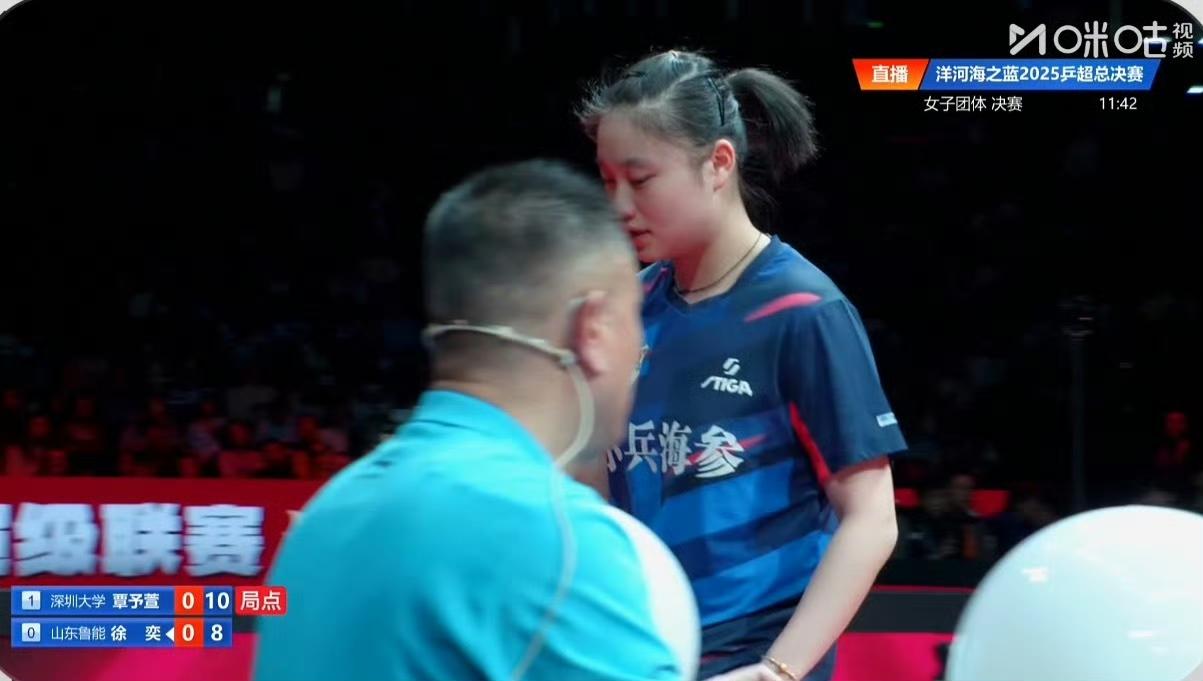 曼昱没上场,在场边愉快观赛呢[笑哭], 第一盘曼昱的山东鲁能队友钱天一/陈幸同竟然0-3不敌蒯曼/平野美宇,山东鲁能先输了一分[捂脸]。 但曼昱不慌不忙在场边给对手以鼓励。 第二盘深圳大学队的覃予萱又2-0领先徐奕了,前两局覃予萱13-11,11-8领先徐奕,山东鲁能危险了[捂脸]。 覃予萱出生于2006年,徐奕出生于2005年,陈熠出生于2004年,三个人年龄差了一点点儿,实力上陈熠、覃予萱领先。 这可是2025年乒超联赛总决赛阶段女团决赛啊,山东鲁能真要放弃了呀[笑哭]。