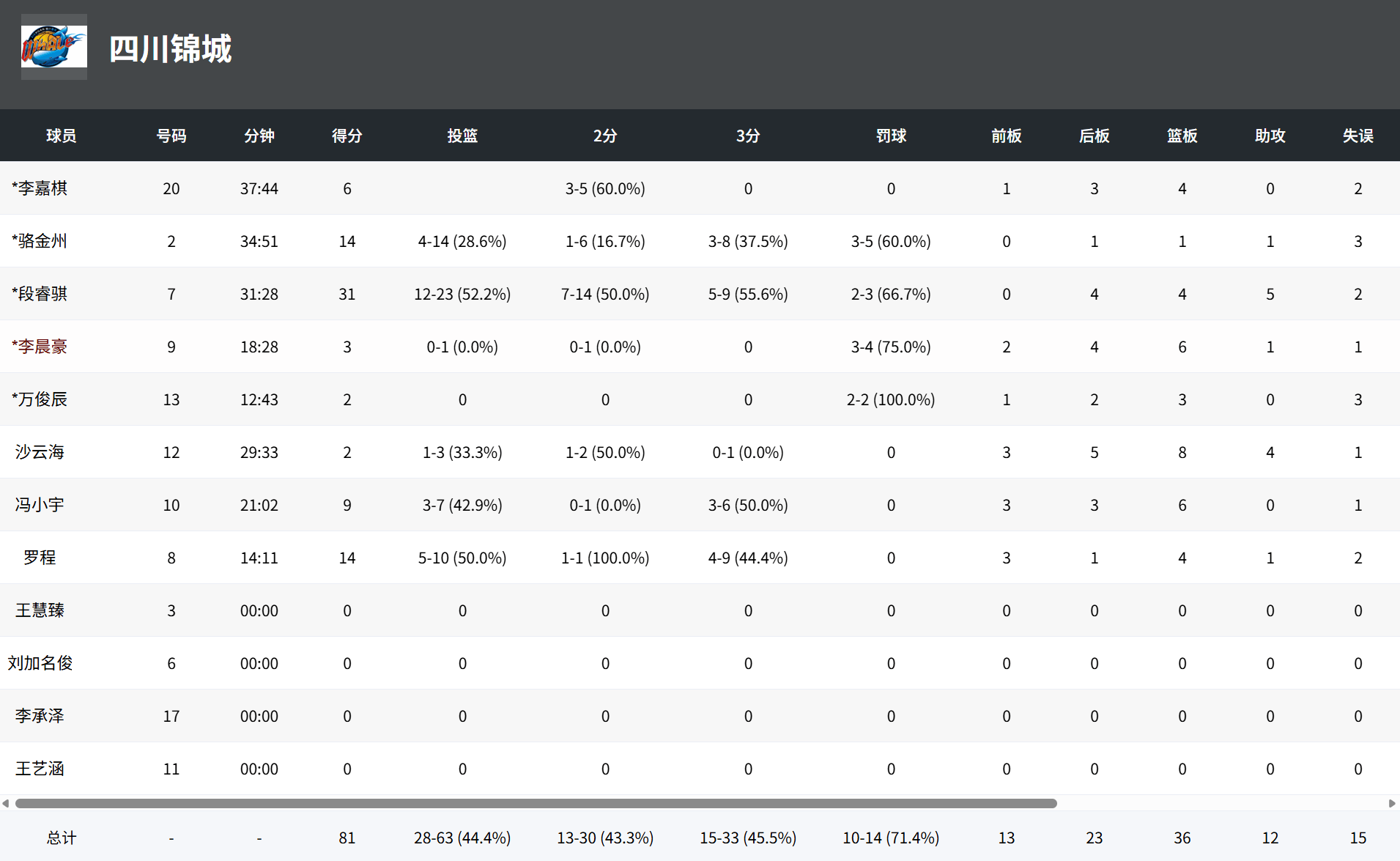 四川:段睿骐31分、骆金州14分、罗程14分。