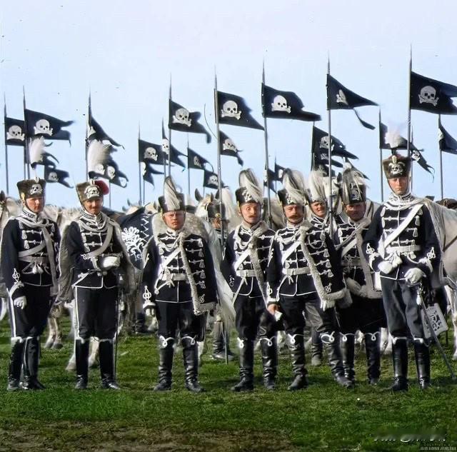 这张彩色照片展示的是1910年德意志帝国陆军第1近卫骠骑兵团的士兵们。这支精锐骑兵团以其独特的制服和骷髅头徽章(德语:Totenkopf)而闻名。 关于德意志帝国第1近卫骠骑兵团 历史渊源: 使用骷髅头标志作为军事徽章的传统始于18世纪腓特烈大帝时期的普鲁士军队,当时是第5骠骑兵团(von Ruesch)的标志。 部队重组: 1808年,该团被重组为第1和第2近卫骠骑兵团,骷髅头徽章仍保留在军帽上。 徽章象征: 这个“死亡之首”符号象征着士兵的勇气,以及为战友和国家牺牲的意愿。它不是纳粹德国时期的发明,但后来被纳粹党卫队(SS)采纳。 驻扎地点: 照片中的士兵们是在但泽(今波兰格但斯克)的朗富尔(Langfuhr)地区拍摄的,当时正在准备一次帝国阅兵。 著名成员: 德国皇储威廉(Wilhelm, Crown Prince)曾担任该团指挥官,并经常穿着该团制服。