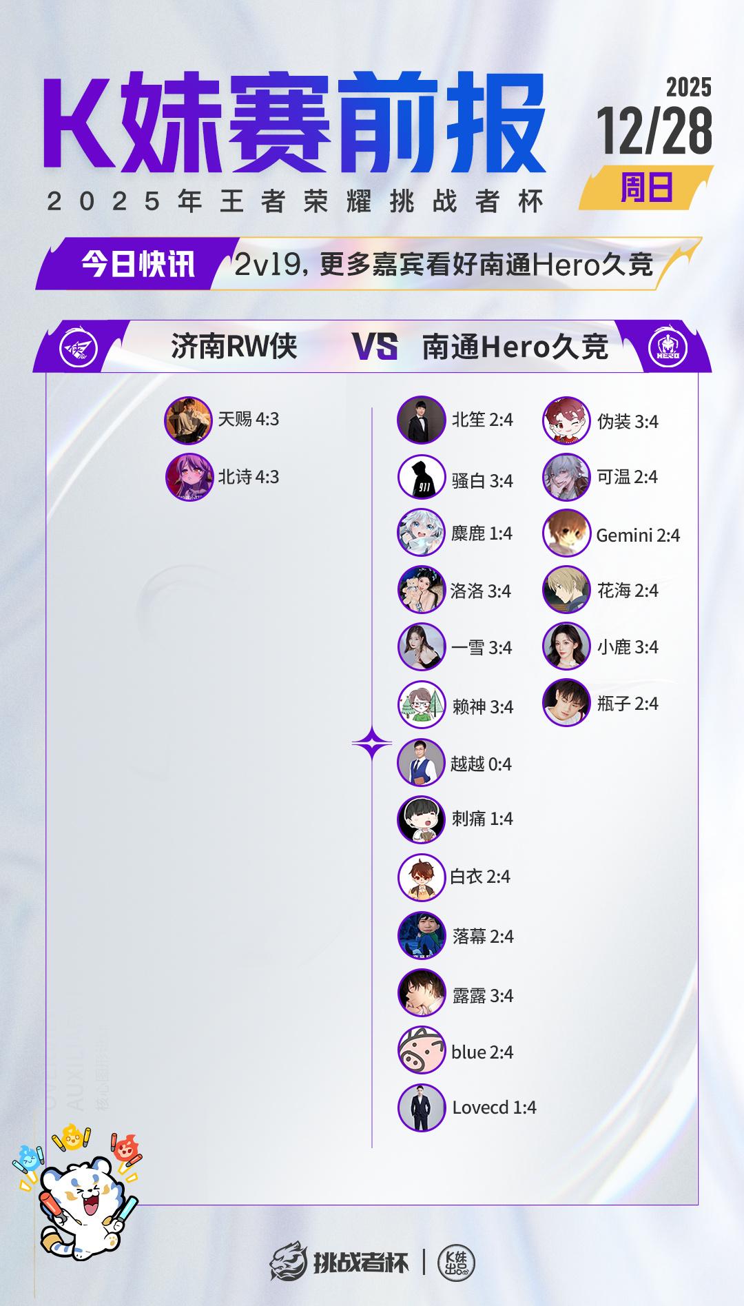 虎扑12月28日讯今日赛前报:2v19,更多嘉宾看好南通Hero久竞,原文如下: