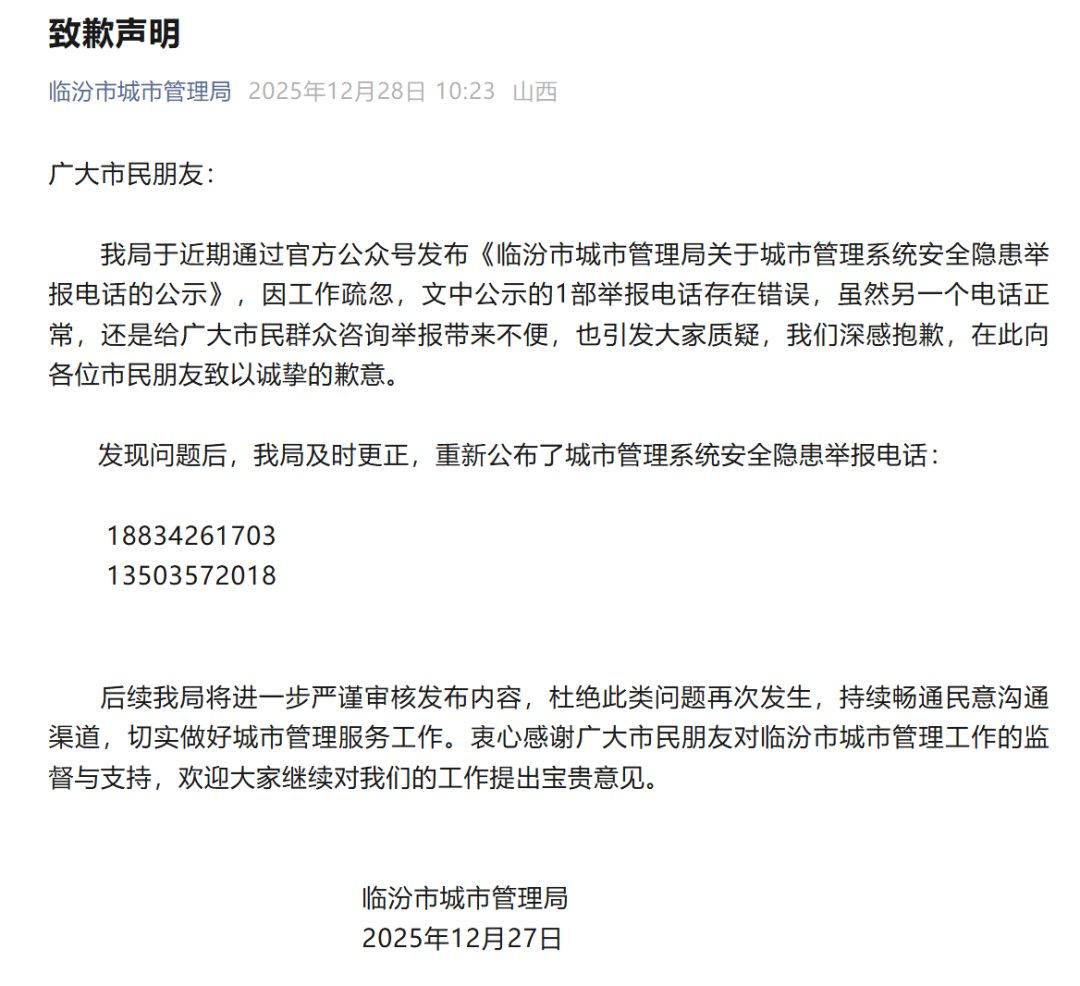临汾市城市管理局12月28日发布致歉声明:我局于近期通过官方公众号发布《临汾市城市管理局关于城市管理系统安全隐患举报电话的公示》,因工作疏忽,文中公示的1部举报电话存在错误,虽然另一个电话正常,还是给广大市民群众咨询举报带来不便,也引发大家质疑,我们深感抱歉,在此向各位市民朋友致以诚挚的歉意。