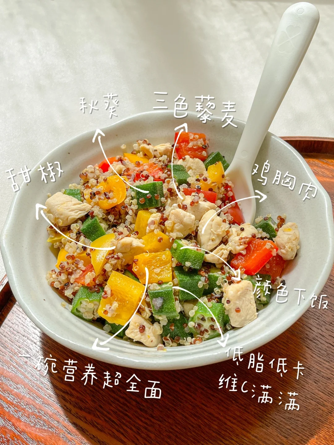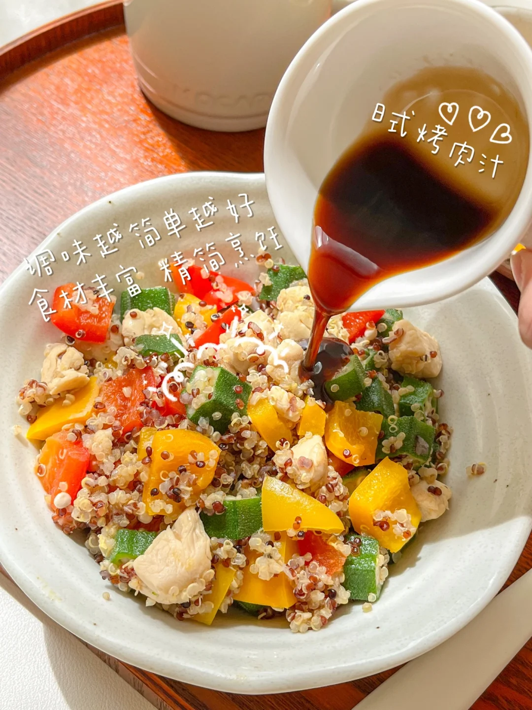 今天还是来吃甜椒,用新鲜健康的食材,最简单的烹饪方式:水煮、清炒。藜麦饭提前泡2小时,再煮15分钟开花,蔬菜炒熟再加藜麦饭。其实做一顿健康料理很简单,也不要需要花很多时间去制作,坚持✊