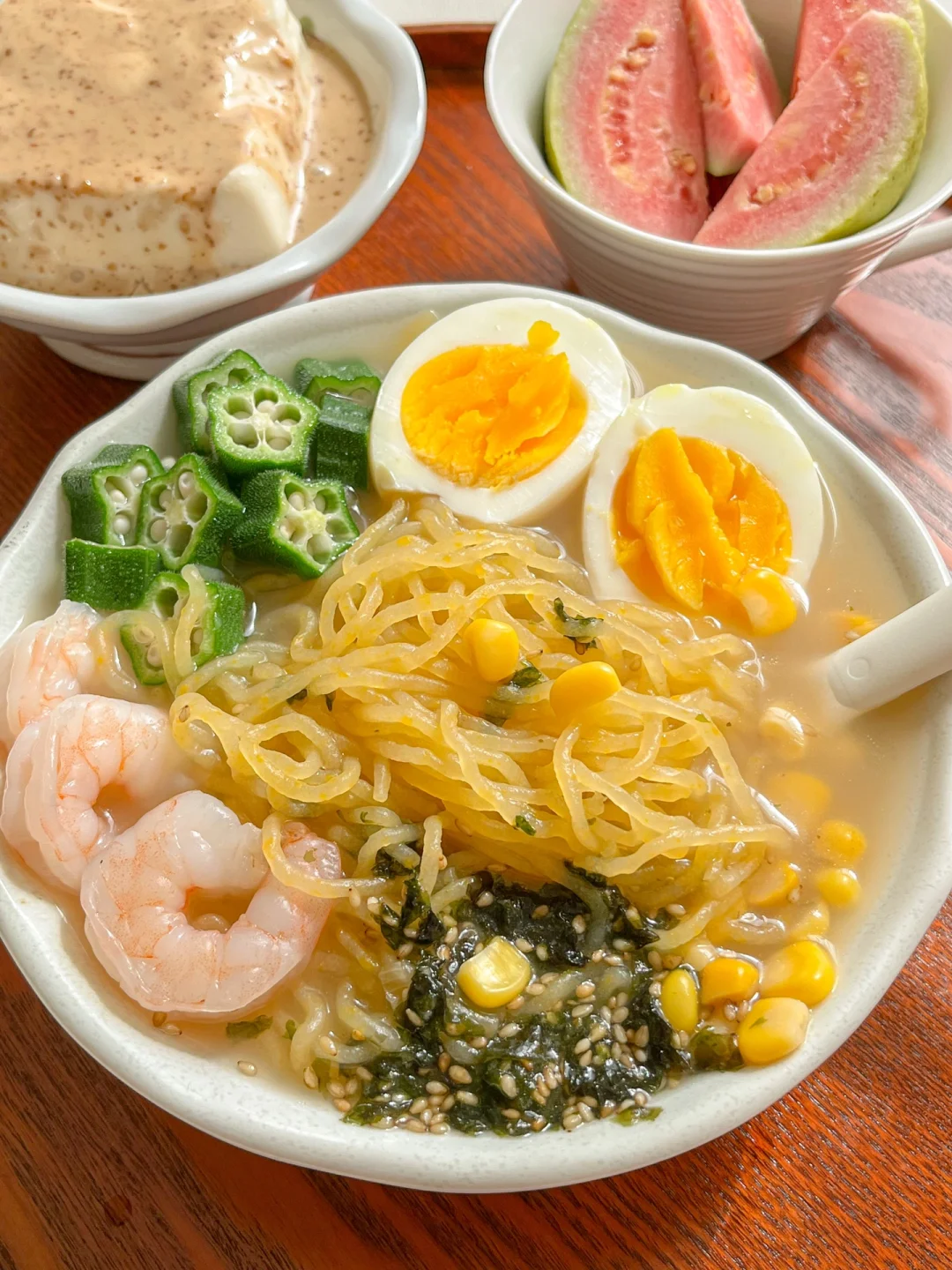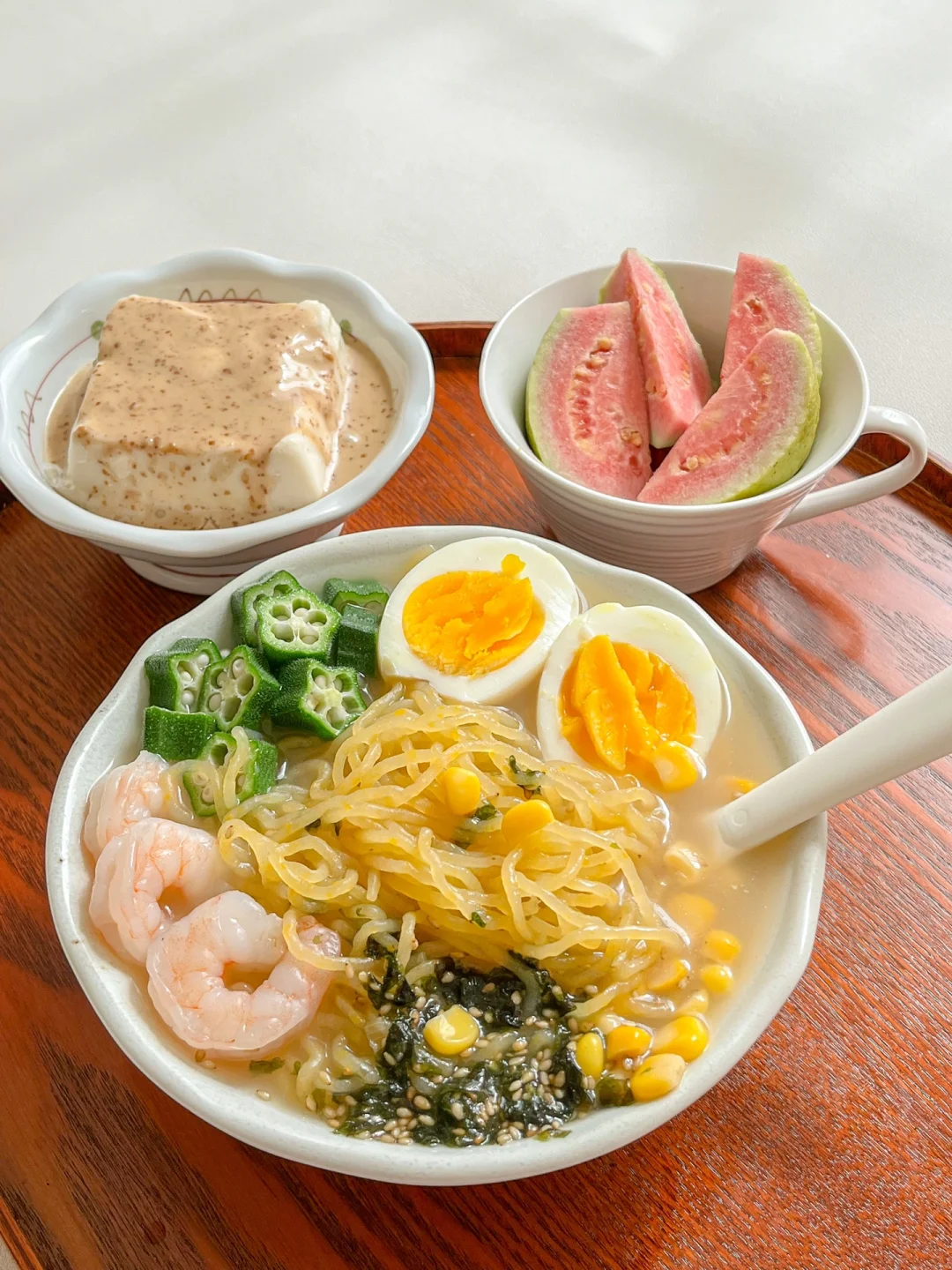 1.流心蛋:水开放入鸡蛋煮3分钟,关火焖1分钟,秋葵焯水