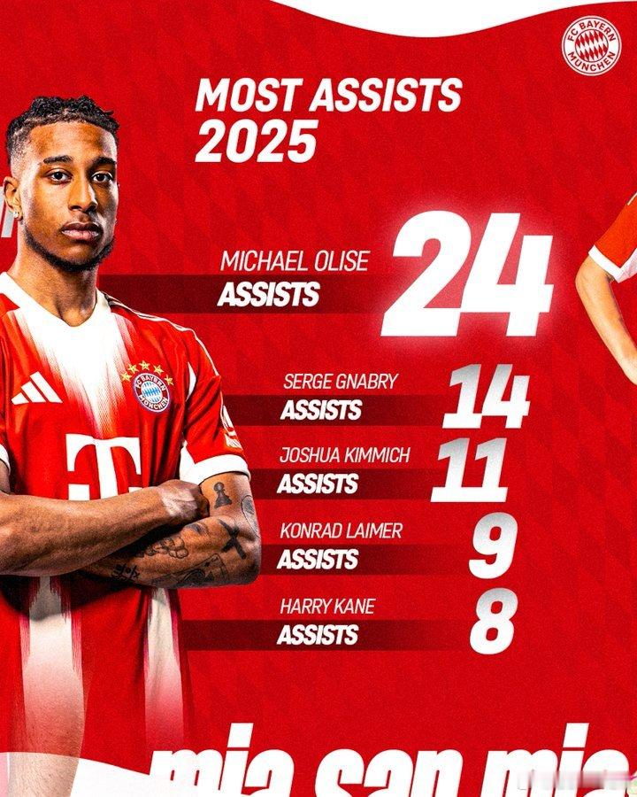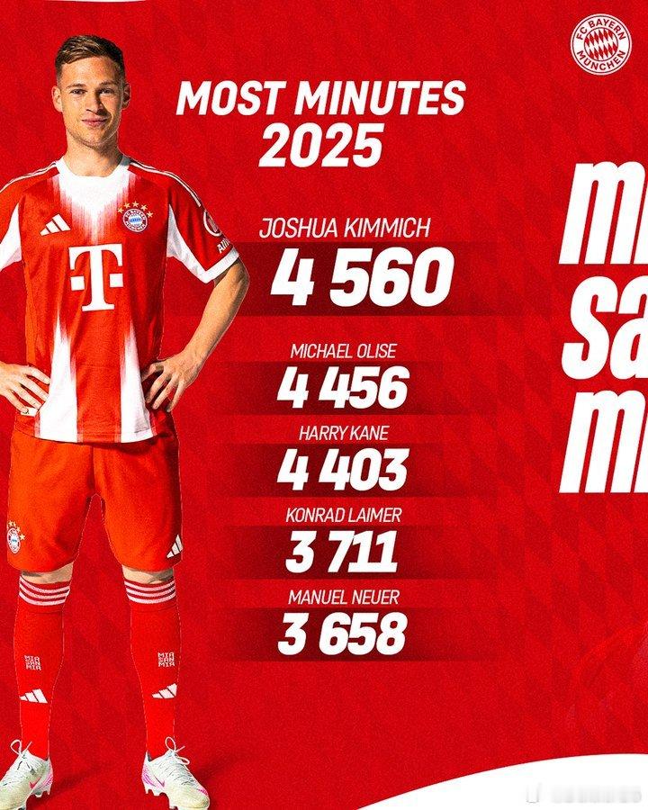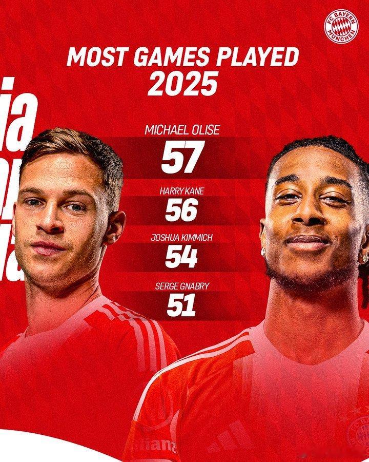 🚨2025年拜仁的進球、助攻、分鐘數和參加比賽最多的榜單🥇🔴⚪️