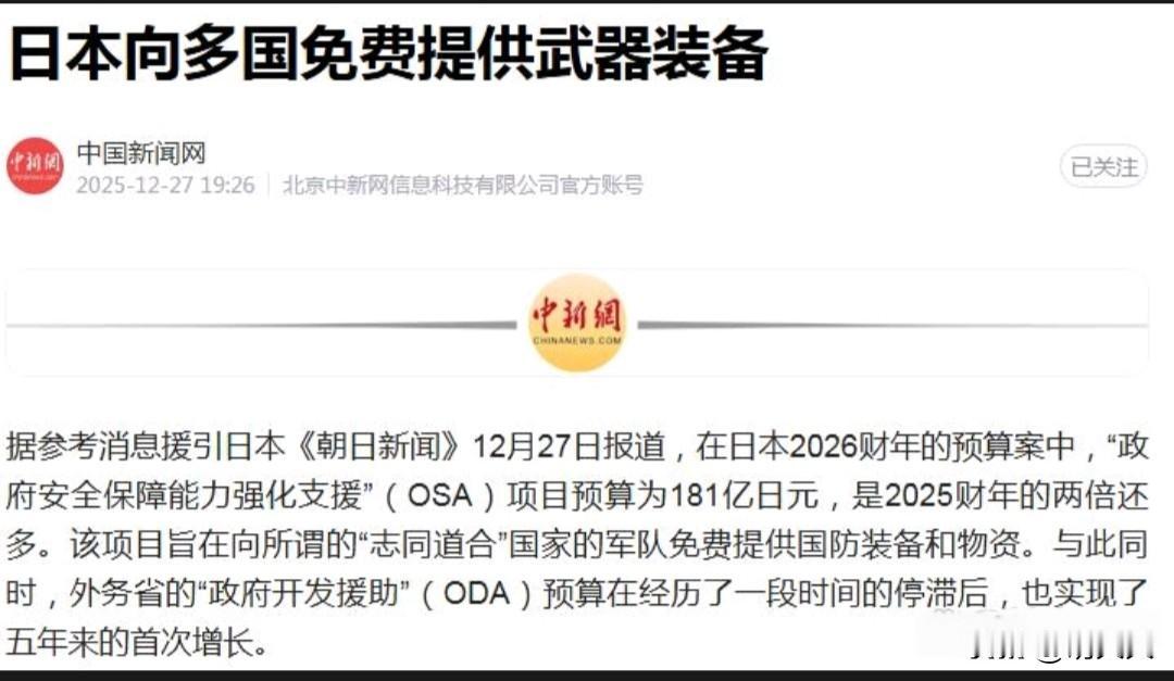 🔥打明牌,日本将向12个国家免费提供武器!美国故意“松开捆在日本身上的锁链”,很明显就是冲着中俄而去的。 2026年,日本将启动一项二战后罕见的“军事赠送”计划:向菲律宾、越南等12个周边国家,免费提供价值1.61亿美元的武器装备,包括军用雷达等高端防御系统。这不仅是日本军工出口的历史性突破,更是美国对其“军事松绑”的关键一步——去年11月,美国已首次批准日本出口“爱国者”导弹,彻底激活了东京的军火输出能力。 这笔高达181亿日元的“免费午餐”,被列入日本“政府安全保障能力强化支援”(OSA)预算,金额较去年翻倍。所有受援国均位于中国与俄罗斯周边,形成一条清晰的战略弧线。专家指出,日本正从“和平国家”转向“亚洲军火桥头堡”,背后是美国推动的围堵中俄布局。 更值得警惕的是,日本已同步修订《防卫装备转移三原则》,可向授权国出口成品武器及杀伤性装备,并已首次向澳大利亚出口护卫舰。军事扩张步伐加速,被批“背离宪法精神,埋下法西斯复活隐患”。 中俄会坐视不管吗?消息称,俄方已提议联合开发南千岛群岛(日称北方四岛),中方也可能加强与区域国家的安全合作。一场以“免费武器”为导火索的亚洲军备竞赛,正在悄然点燃…… 这场“军援狂欢”是真援助,还是裹着糖衣的地缘炮弹?中俄的反制,或许才刚刚开始。 图片来自网络,侵删!