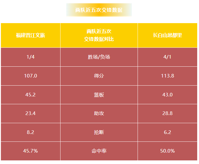 福建晋江文旅与长白山恩都里历史上一共交手49次,福建晋江文旅27胜22负。