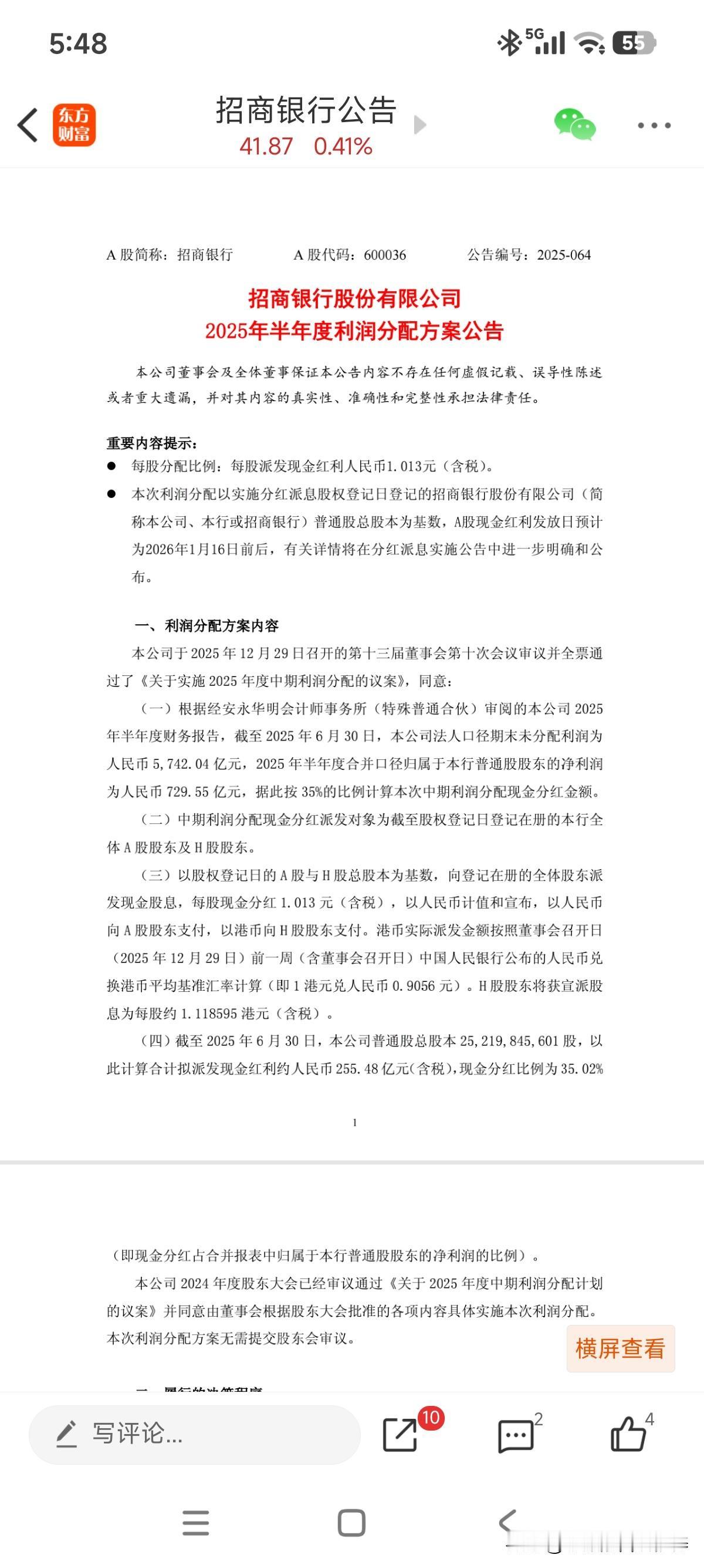 中期分红来了,每10股发放10.13元!之前就说过,招行半年报明确写了有中期分红