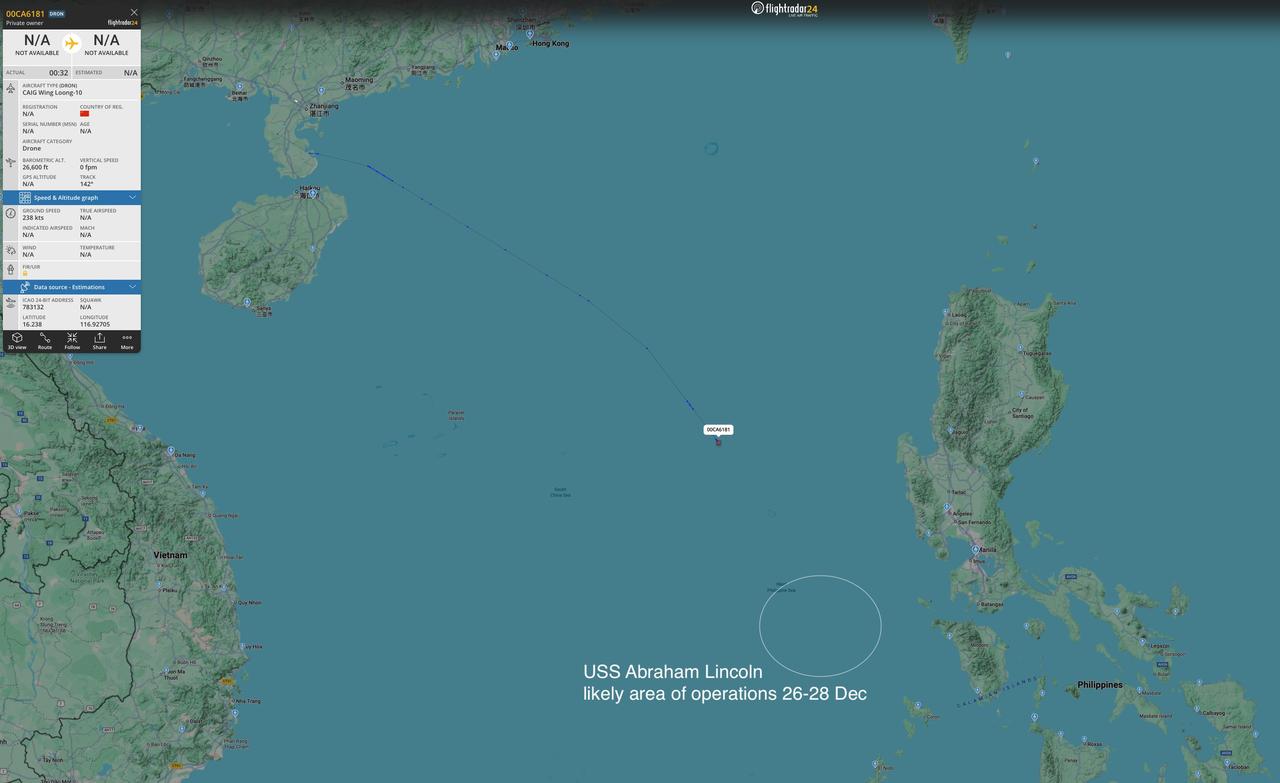 【林肯号在南海过圣诞,解放军无侦-10南下找航母】 圣诞节前夕,开源情报显示美国海军林肯号航母经菲律宾群岛圣贝纳迪诺海峡驶入南海,在这里度过了圣诞假期。 随后有消息称,林肯号航母前往南海南沙群岛海域活动。目的地未知,可能是要给菲律宾站台。 在林肯号行动的同时,有开源情报显示解放军一架无侦-10无人机也在近期前往南沙群岛海域活动。 有猜测说,无侦10是去南海找林肯号航母去了。 这并非不可能,无侦-10的航程足以覆盖整个南海,同时它的侦察范围也很远,可以在林肯号航母的舰载机拦截半径外发现,并展开追踪。 最重要的是,为了防止美军搞事,解放军有必要对美军航母展开全方位跟踪监视。平时是靠海警船、护卫舰,有无人机提供辅助在正常不过了