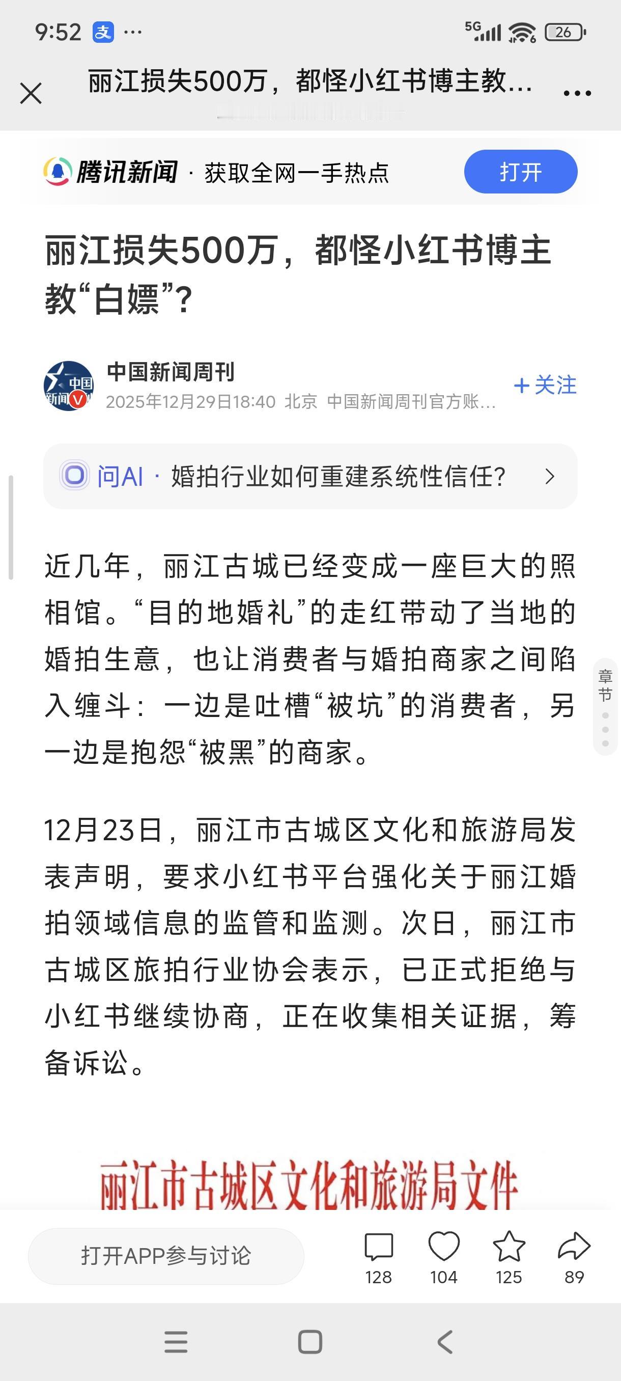 小红书被央媒点名批评没几天,又被丽江古城文旅局发函谴责! 起因是网友在小红书发关于丽江古城拍婚纱照的“避雷贴”,没想到把当地的婚照行业干黄了,几乎接不到生意了,导致婚照行业间接损失500万。 对于“避雷贴”,商家认为属于不实信息,提供的投诉材料平台不支持。眼看生意没办法继续了,丽江古城的旅拍行业协会就找文旅局出面协调,文旅局直接喊话,要求小红书派专人与其对接,旅拍协会更是强硬表态,拒绝协商,准备起诉! 据中国周刊新闻报道,有消费者去丽江古城拍婚纱照,全程体验不好,衣服是随机的,拍出来的照片也不是自己想要的效果。后续选照片的过程中,商家又是各种推销,精修的照片一张100元,想拿走原片自己修,商家又不给,不付费的话,商家态度非常差。精修完的照片和剪辑的视频也不是自己想要的效果,提出意见后,修改还要等长时间。 有消费者一气之下,就在小红书上吐槽商家,商家为了维护声誉,就主动联系消费者退款,并要求删帖。本以为退款删帖后事件就过去了。没想到,有消费者就此写了如何在丽江古城“白嫖”拍婚照的帖子,还建群专门指导。 对此,有好多消费者就去丽江古城拍婚照,最后以不满意为由发“避雷贴”,胁迫商家退款。果然,商家就退款了。事件传开之后,拍照的几乎全是奔着“白嫖”去的,一旦商家不退款,就给差评,发“避雷贴”,人多了,商家也赔不起。 后来,因为差评太多,导致有些商家订单量从日均30单锐减至多日无一单。对于消费者恶意抹黑,商家试图反击,可提供的各种证据均被平台驳回,未获得支持。小红书平台反馈称,商家未能提供真实证据,系统为非人工审核,无法判定材料签字的真实性。 更可笑的是,有的商家“打不过就加入”,通过杜撰避雷帖贬低同行,为自己引流。有的商家为了维护自身利益,与消费者产生冲突,反而承受了更多经济损失。 舆情发生后,几乎没人去丽江古城拍婚照了,商家觉得自己可冤,通过协会将问题反映至文旅局,请文旅局出面做主。 没想到,12月23日,文旅局为此直接给小红书科技有限公司发函,请求小红书对相关的“避雷贴”及不实言论加强监管、监测,并要求小红书派专人与其对接解决。 从文旅局发的函件中来看,在商家没有过错的情况下,消费者通过抹黑威胁商家退款,商家没办法申诉,不仅声誉受到影响,还导致退订100余万元,间接损失500余万元。文旅局认为平台作为主体单位,监管和审核到位。旅拍协会更是强硬表态,拒绝与小红书继续协商,正在收集相关证据,筹备诉讼。 最近,小红书因无理由屏蔽深圳新闻网发布的关于“电动车新规”的民生新闻视频,引发央媒质问。而这次丽江古城文旅局和旅拍协会的“喊话”,表面上是在指责小红书上的“恶意避雷帖”,实则是在控诉一种新型的、低成本的商业勒索模式,以及平台在面对这种模式时的监管缺位。 其实,拍过的人都知道,在选照片的时候,商家是各种加价,不加钱就修多余的照片,也不会给消费者,这种是非常令人反感的。现在协会准备起诉小红书,而小红书这边需要证明大家发的帖子是真实的、不是胁迫威胁的,估计好多人愿意提供证据。 总之,要想生意好,“真诚才是必杀技”!