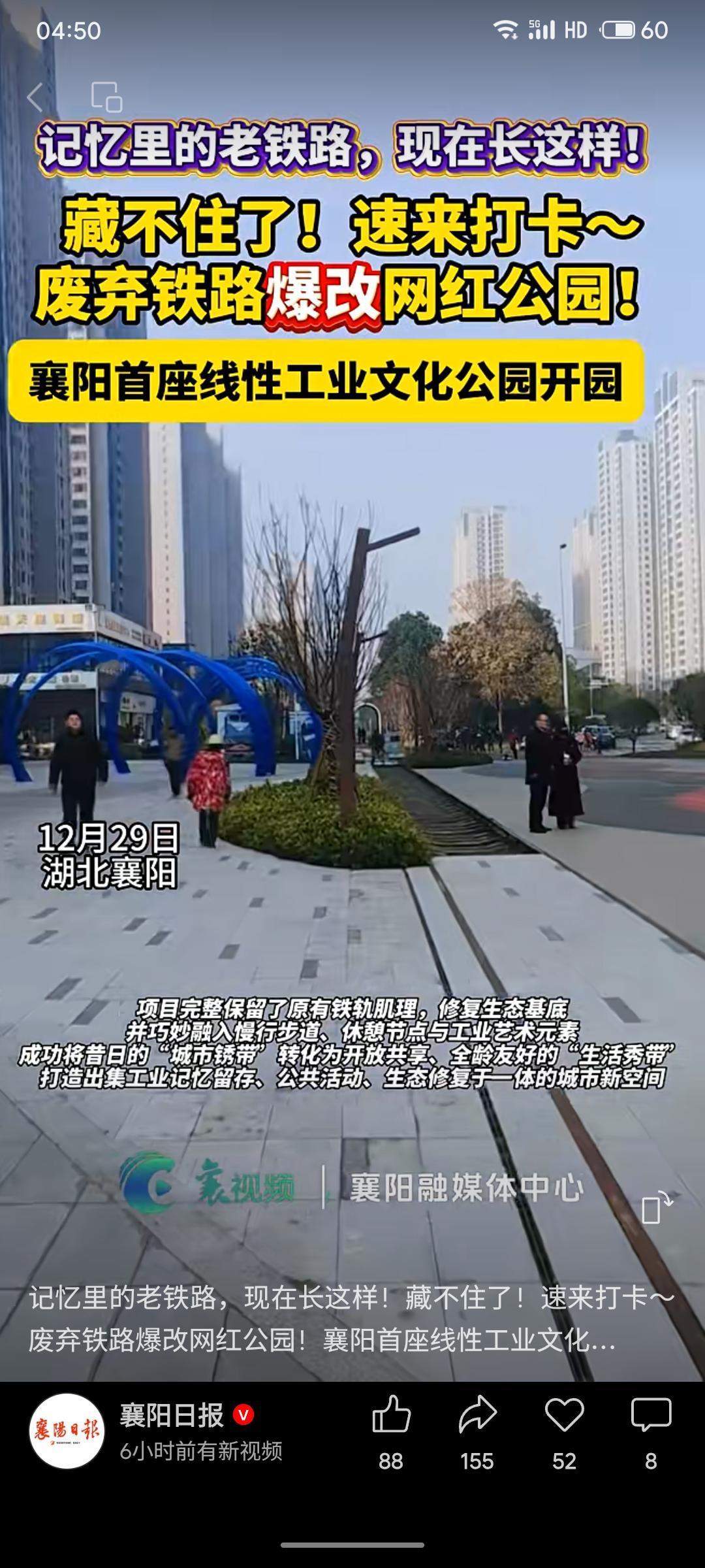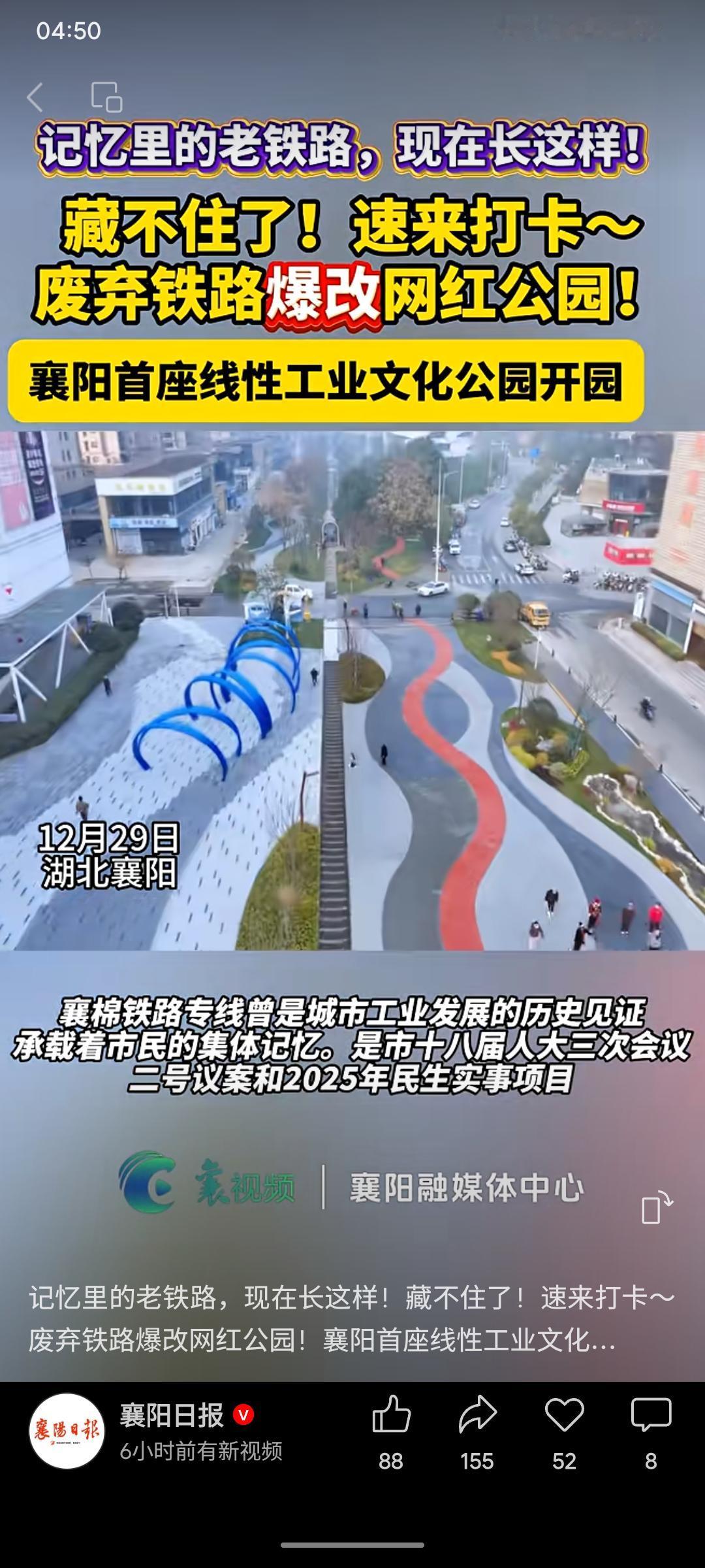 湖北襄阳将废弃的襄棉铁路专线改造为长约1.6公里的线性工业文化公园,保留铁轨肌理,融入步道与艺术元素,使“城市锈带”转型为集历史记忆、公共活动与生态修复于一体的开放空间,成为城市更新与工业遗产活化利用的典型案例。
