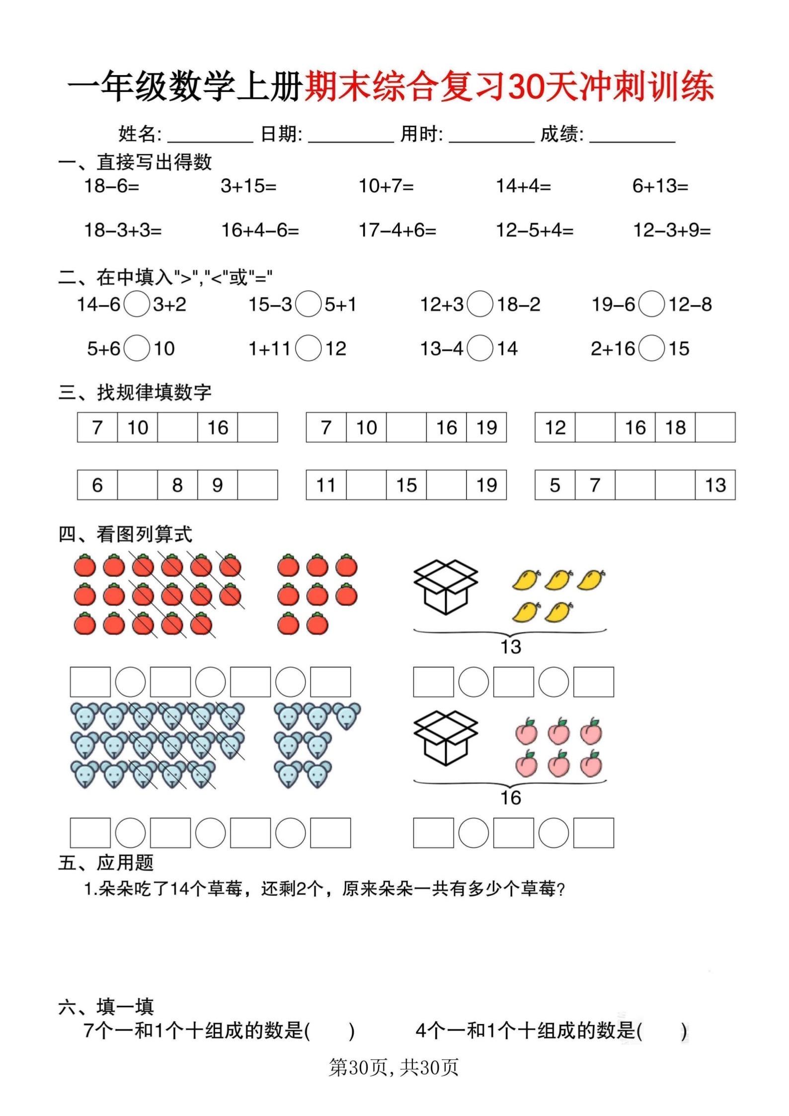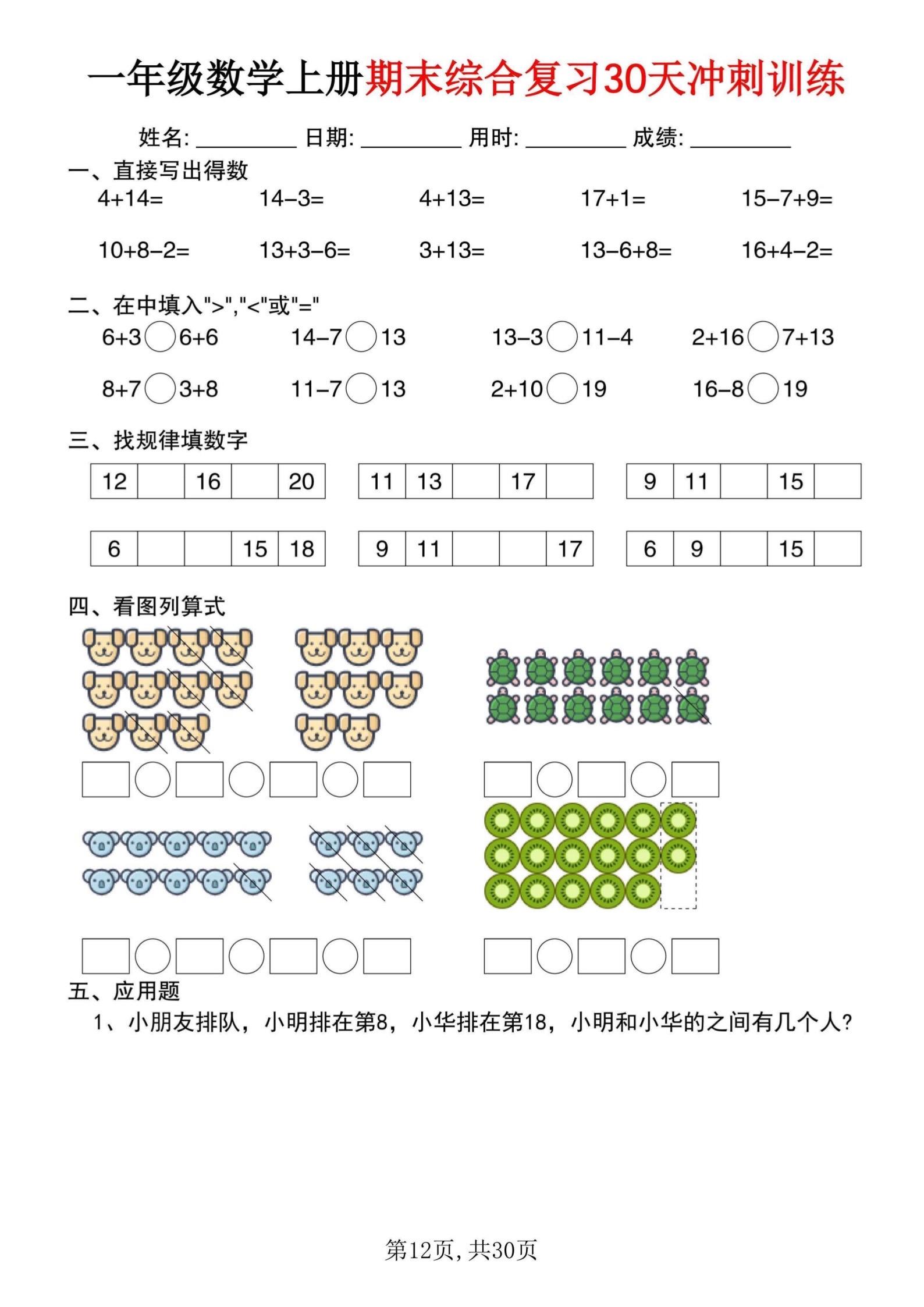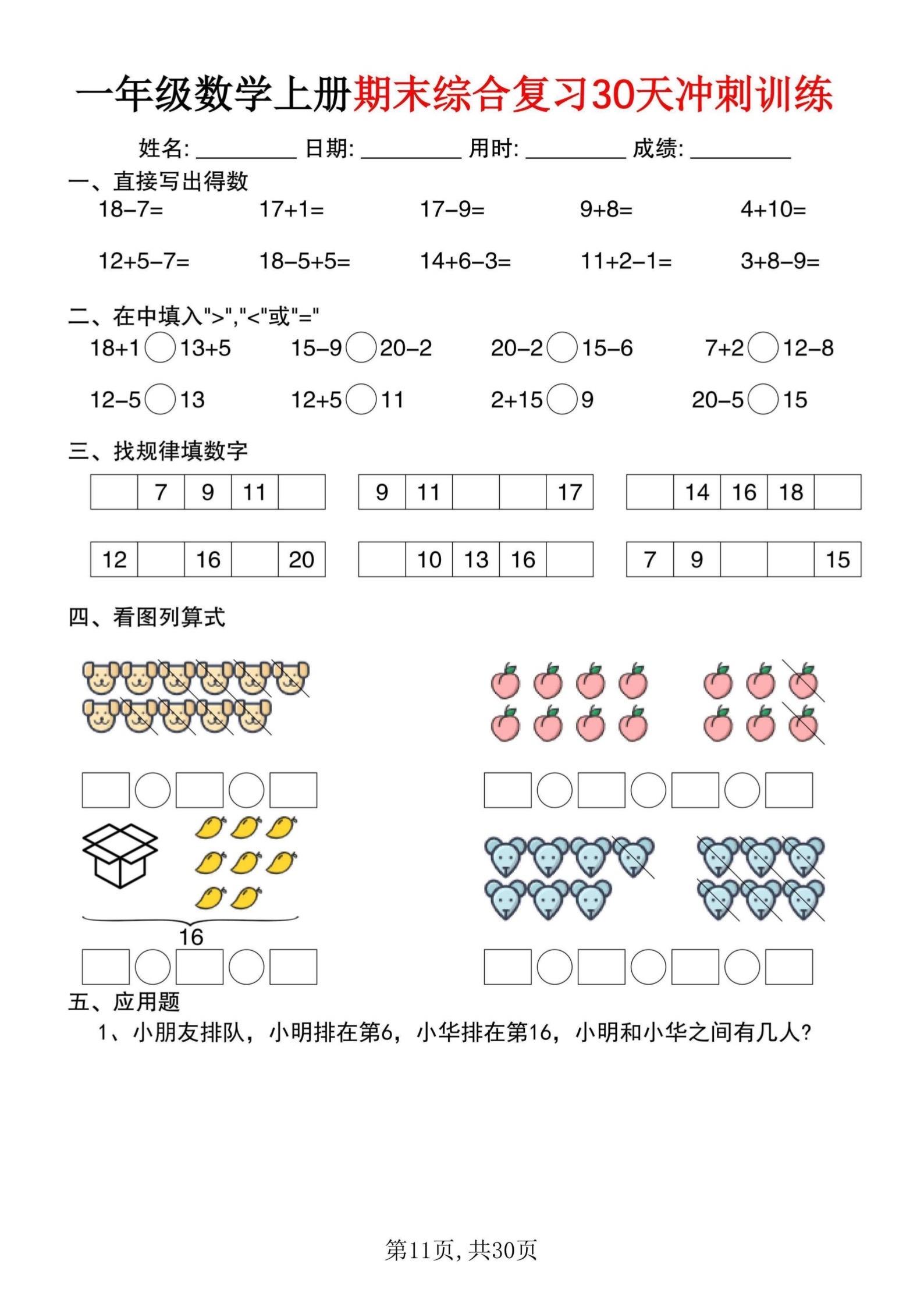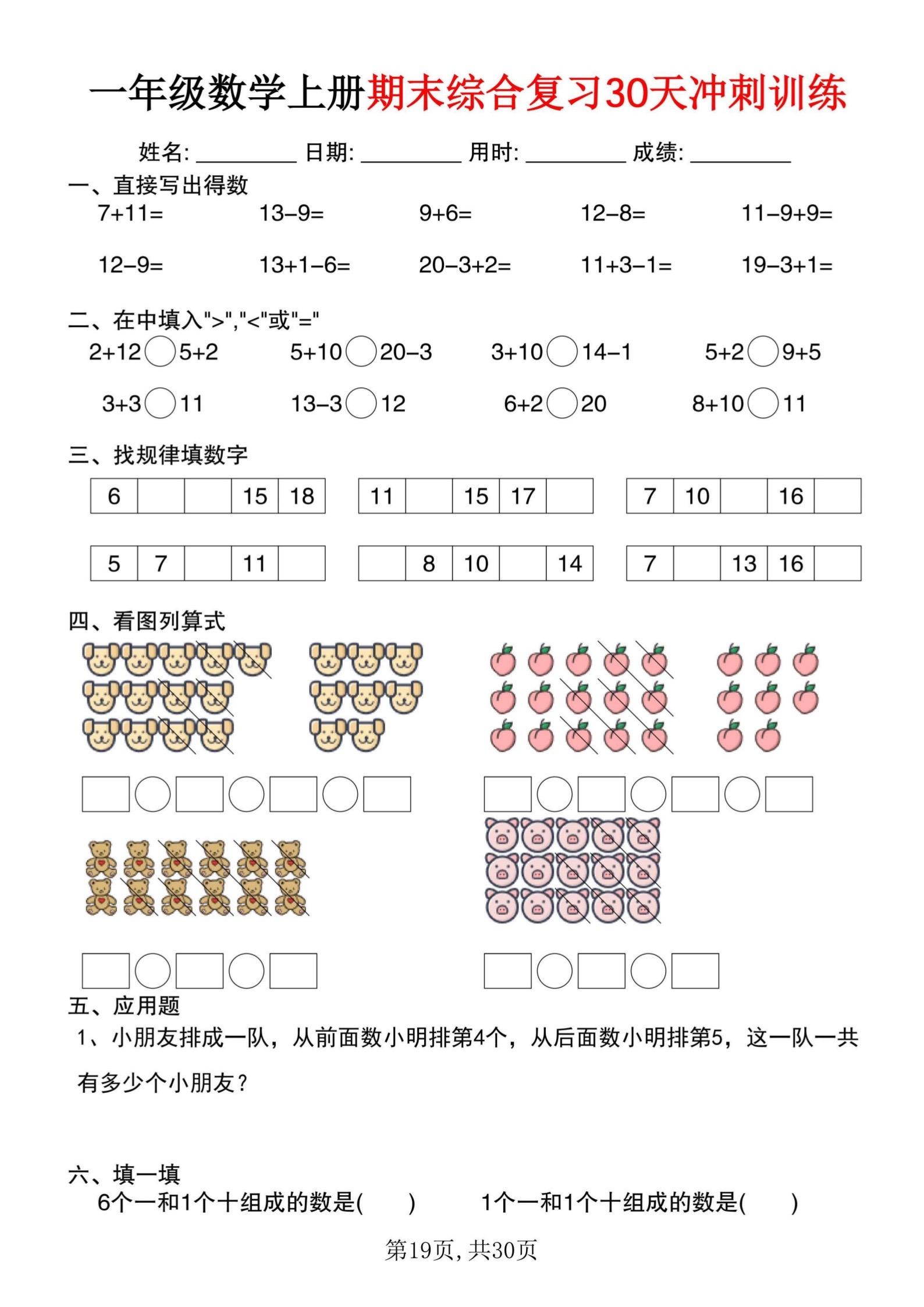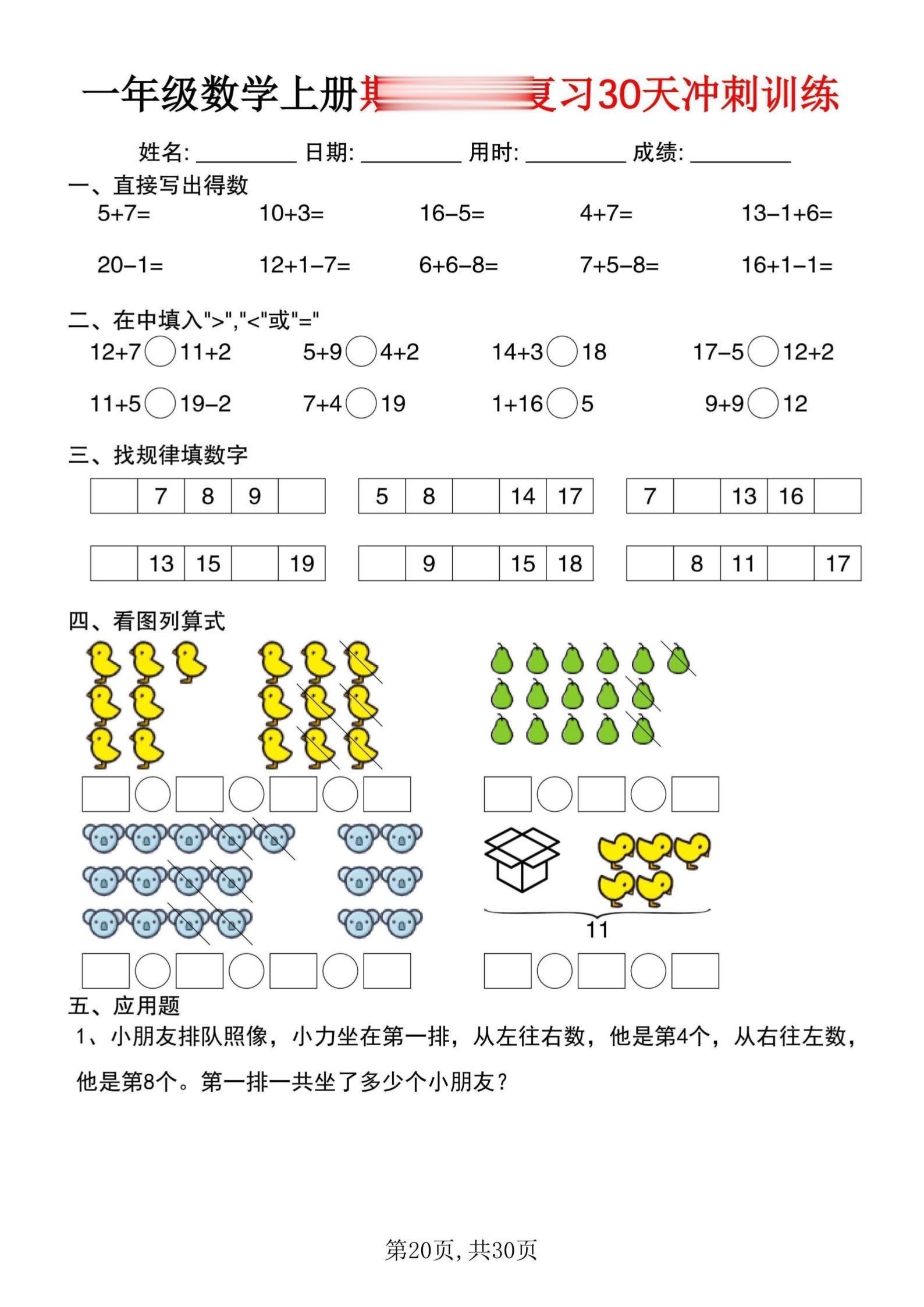 一年级上册数学期末冲刺练习。学习辅导资料 期末复习 必考考点 今日分享 每天跟我涨知识 有需要可以自行下载打印