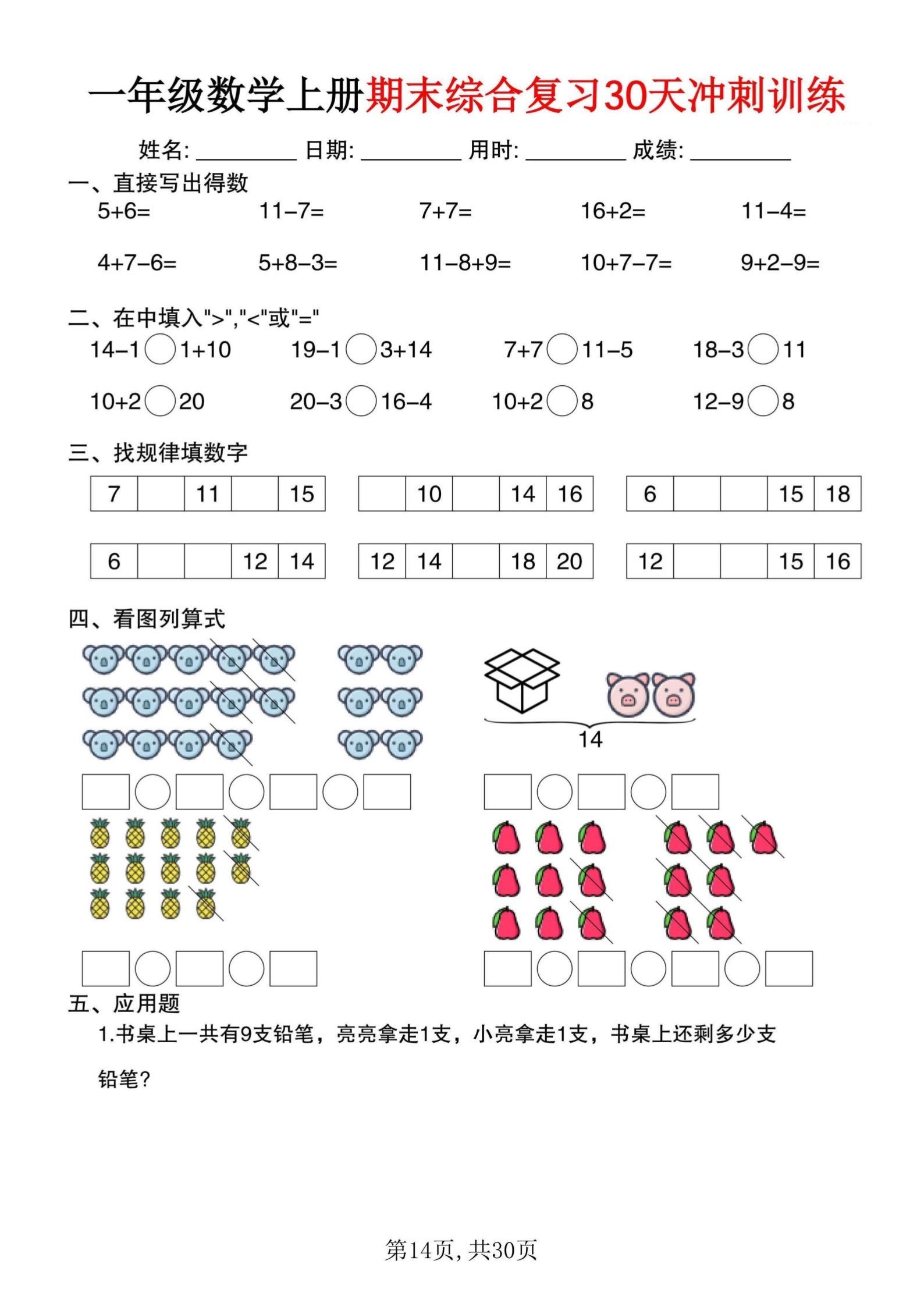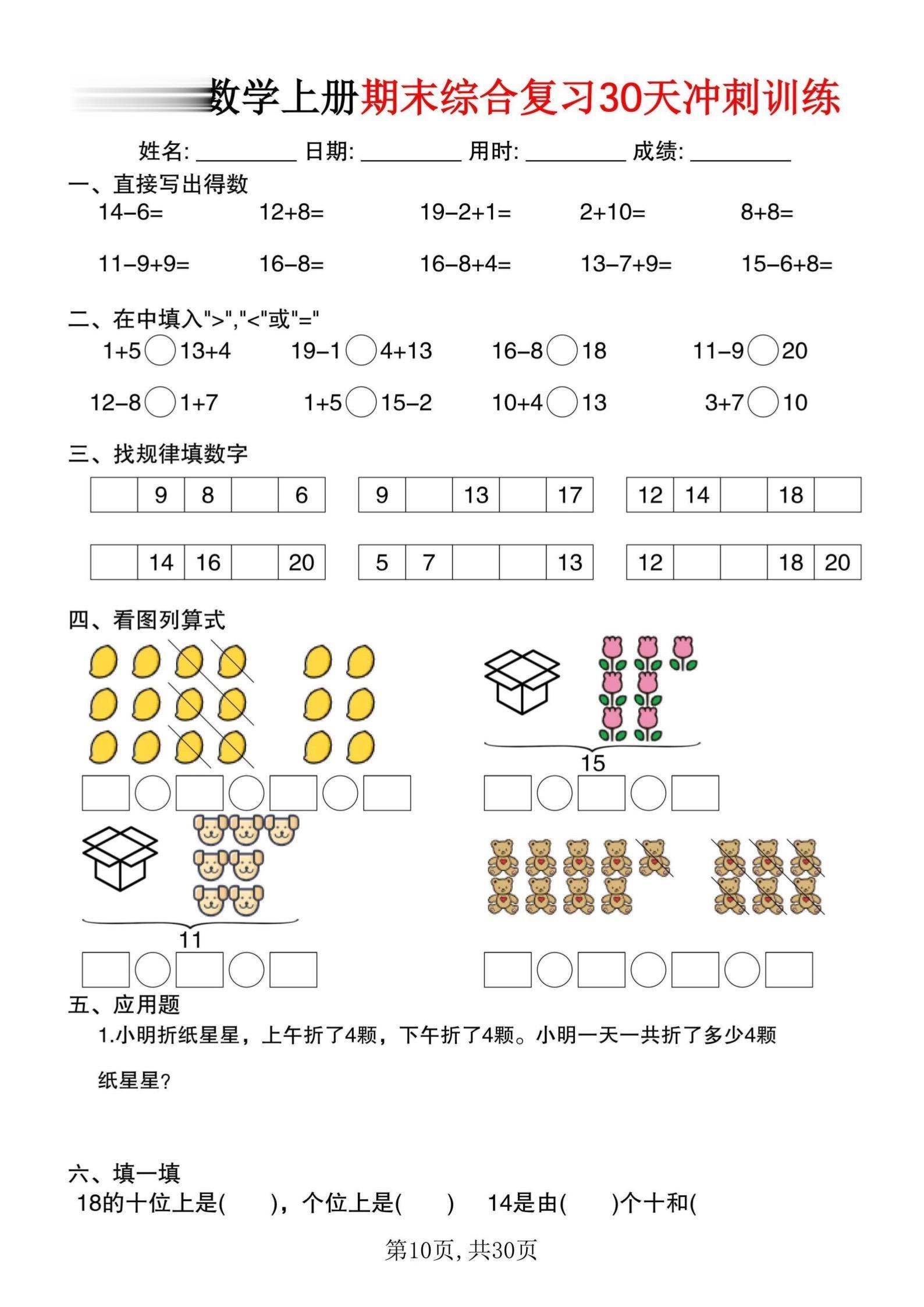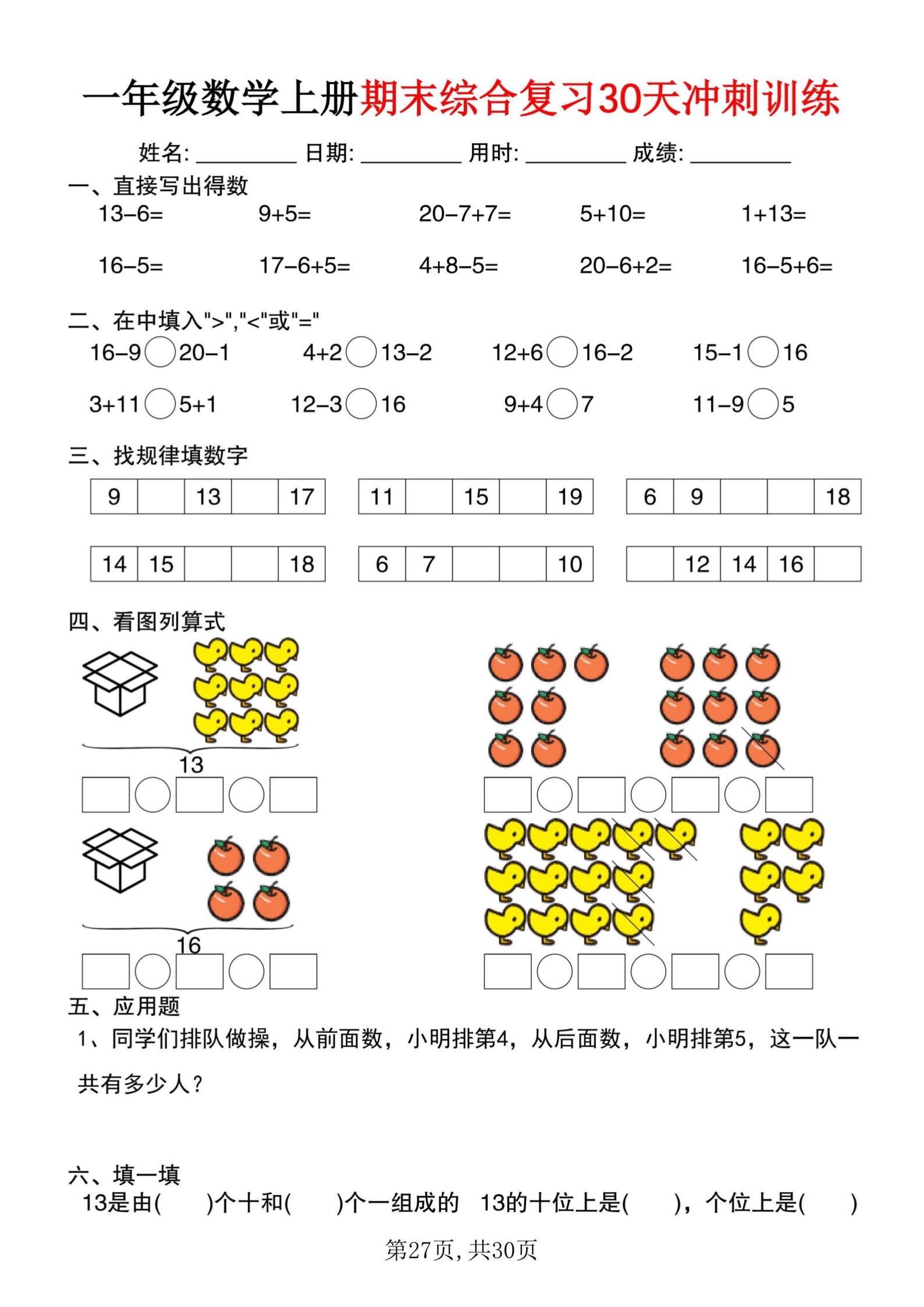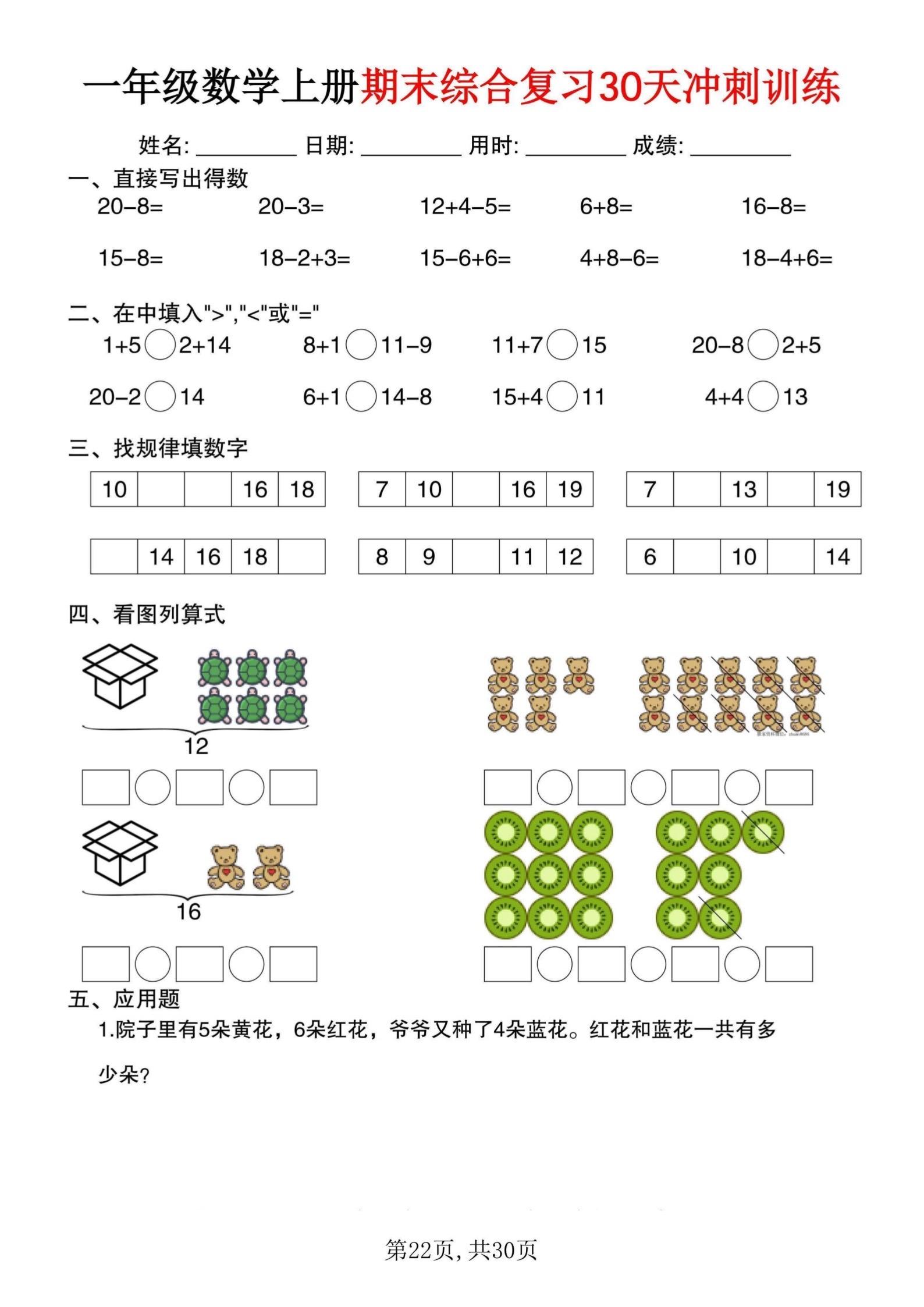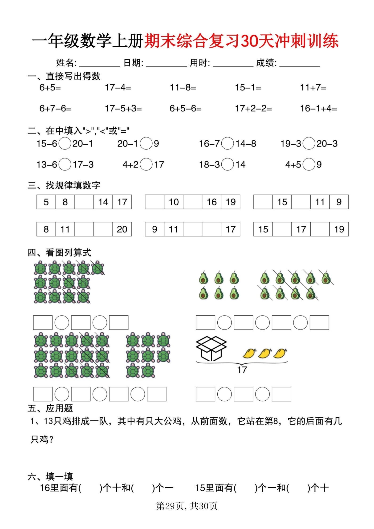 一年级上册数学期末冲刺练习。学习辅导资料 期末复习 必考考点 今日分享 每天跟我涨知识 有需要可以自行下载打印