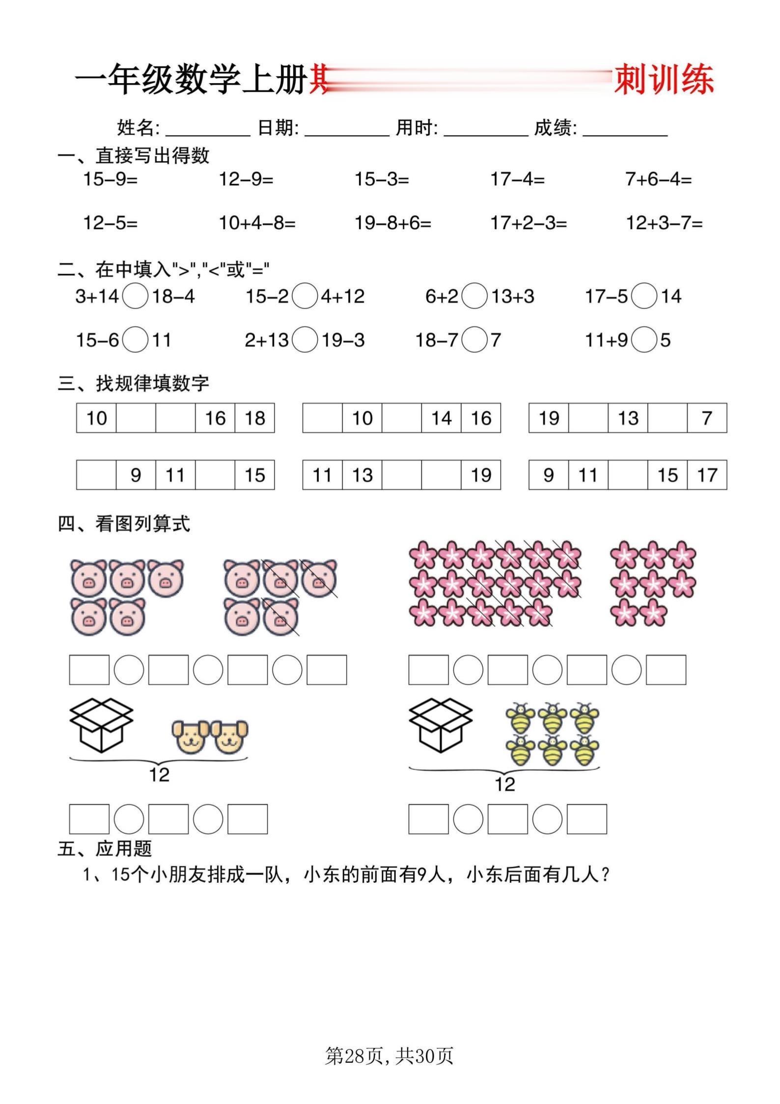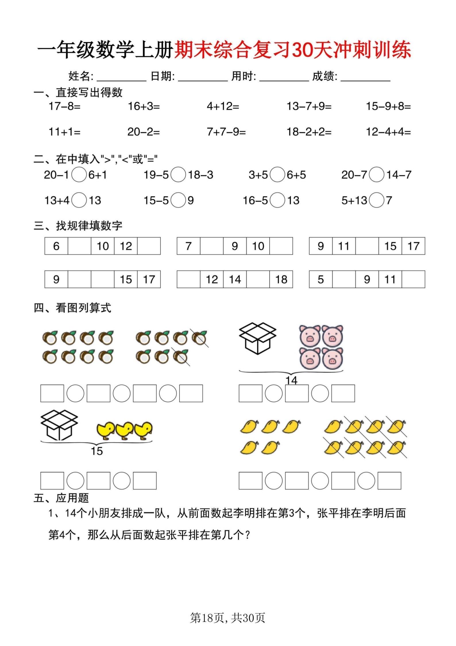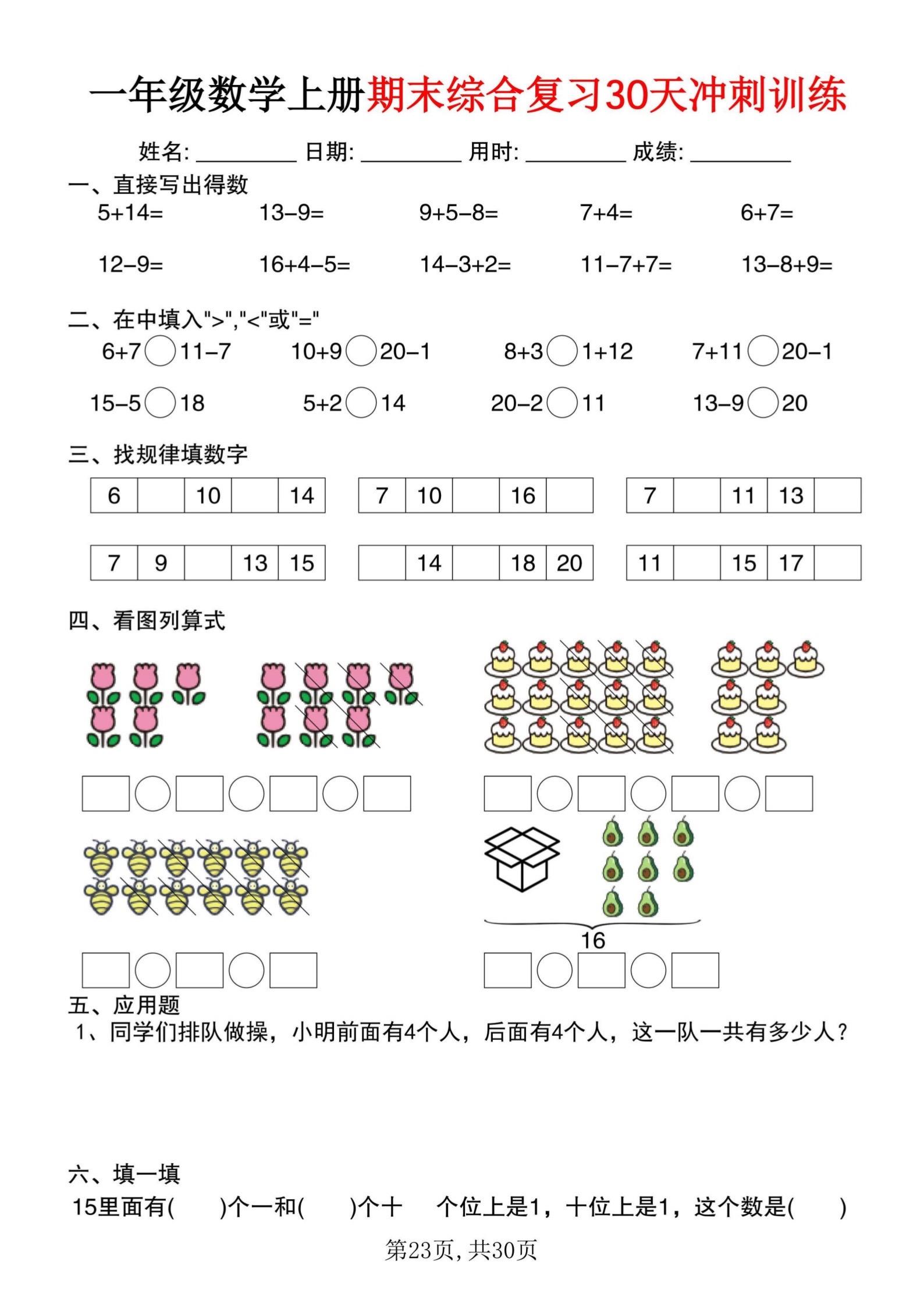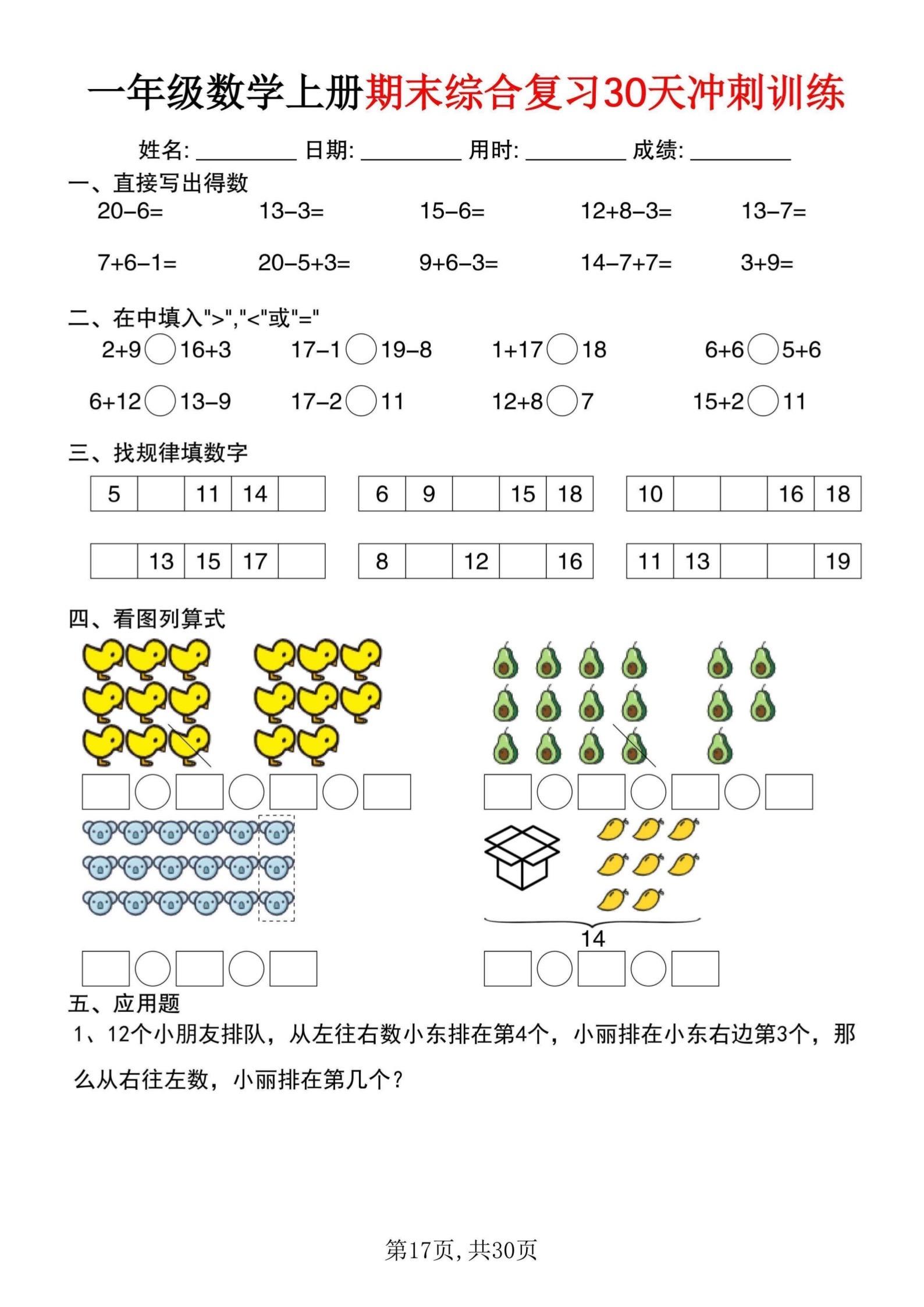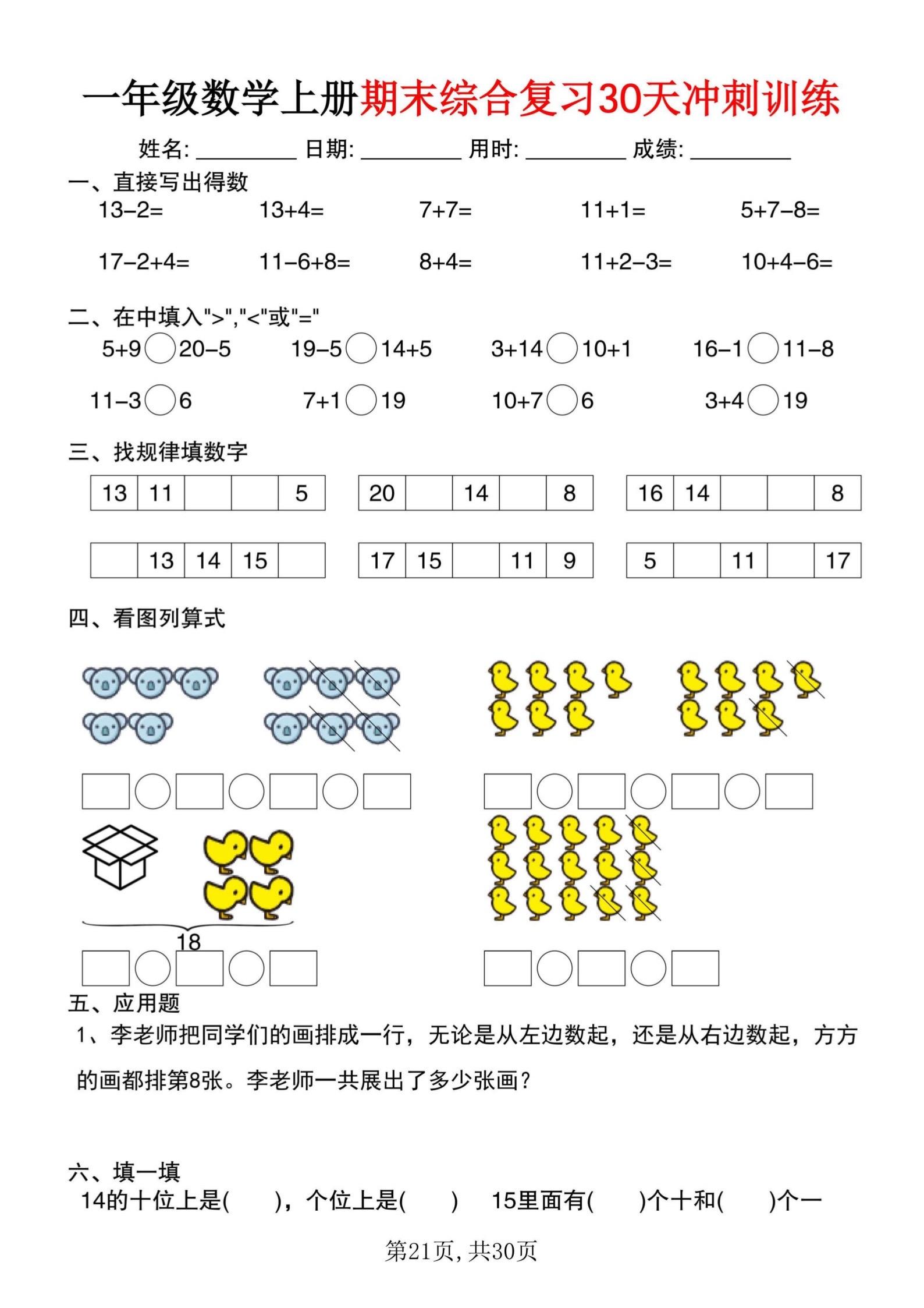 一年级上册数学期末冲刺练习。学习辅导资料 期末复习 必考考点 今日分享 每天跟我涨知识 有需要可以自行下载打印