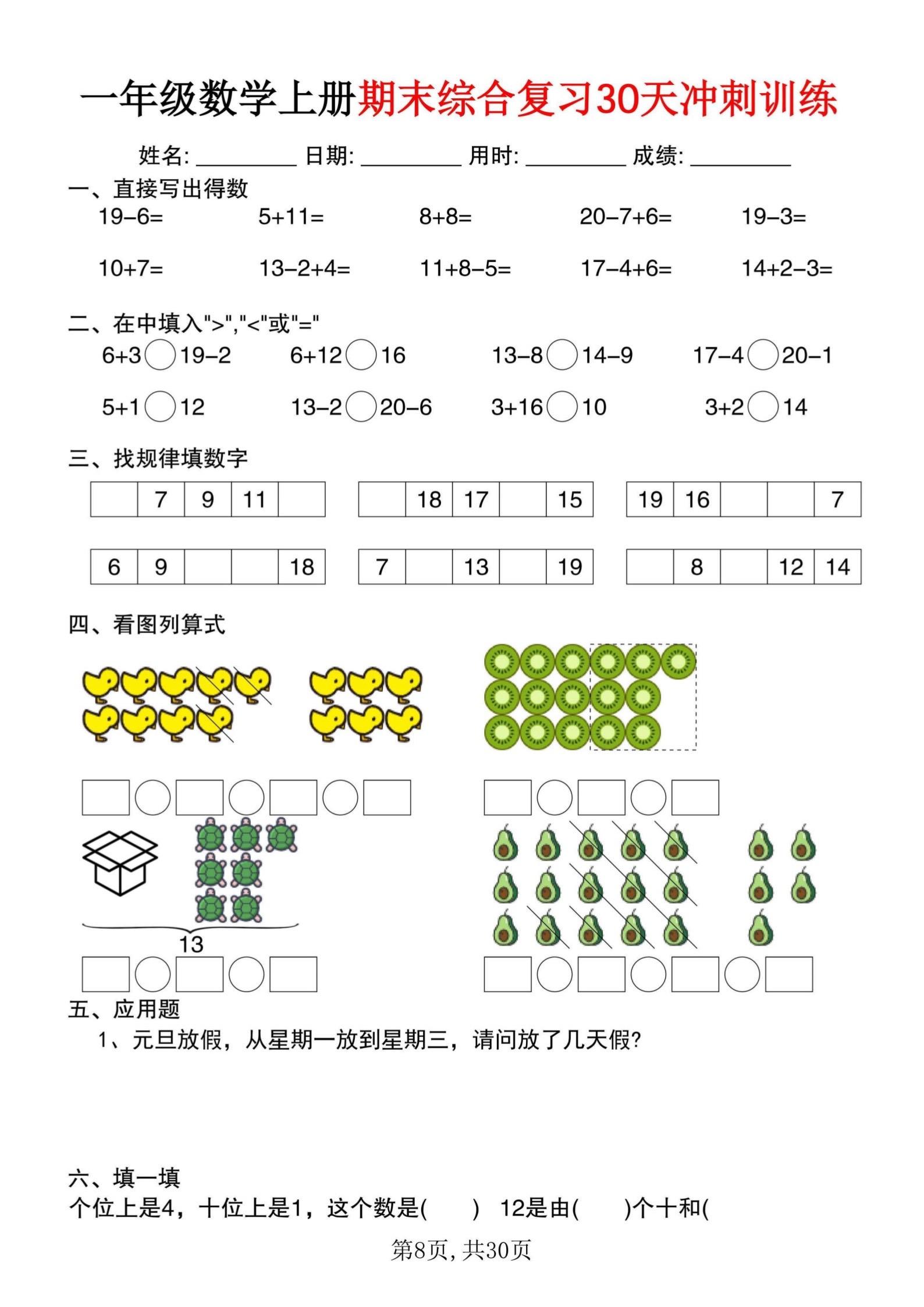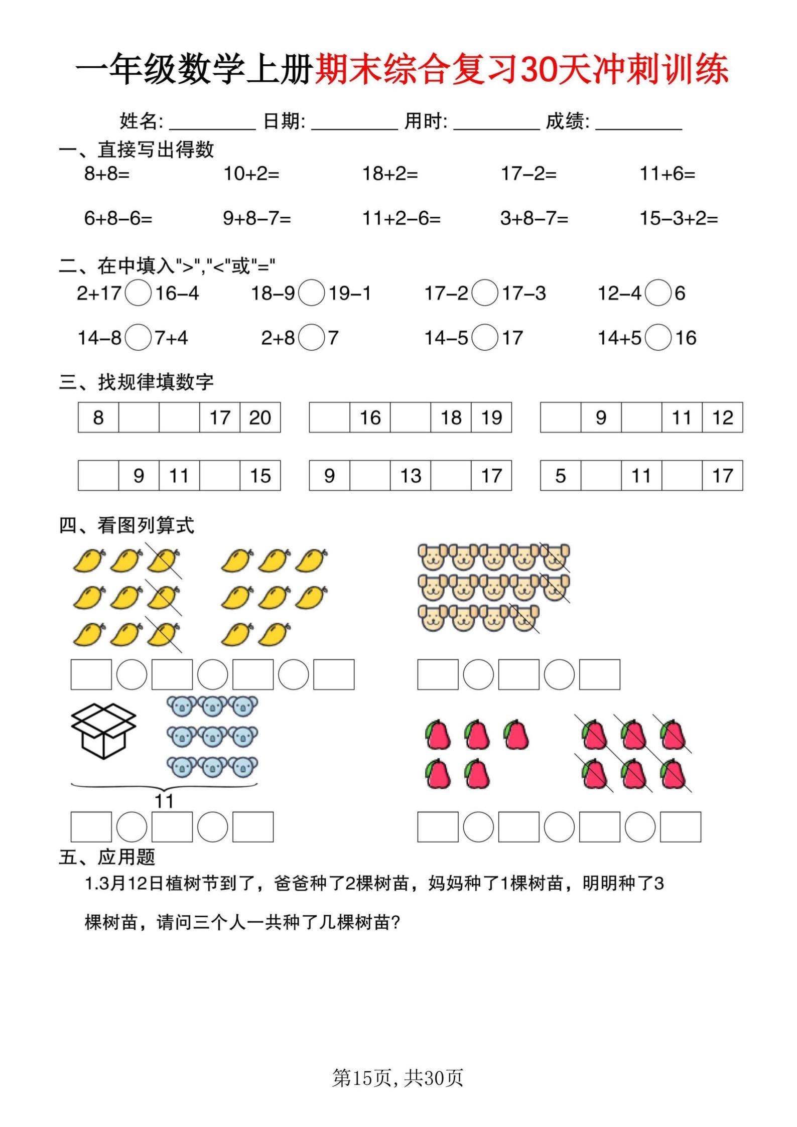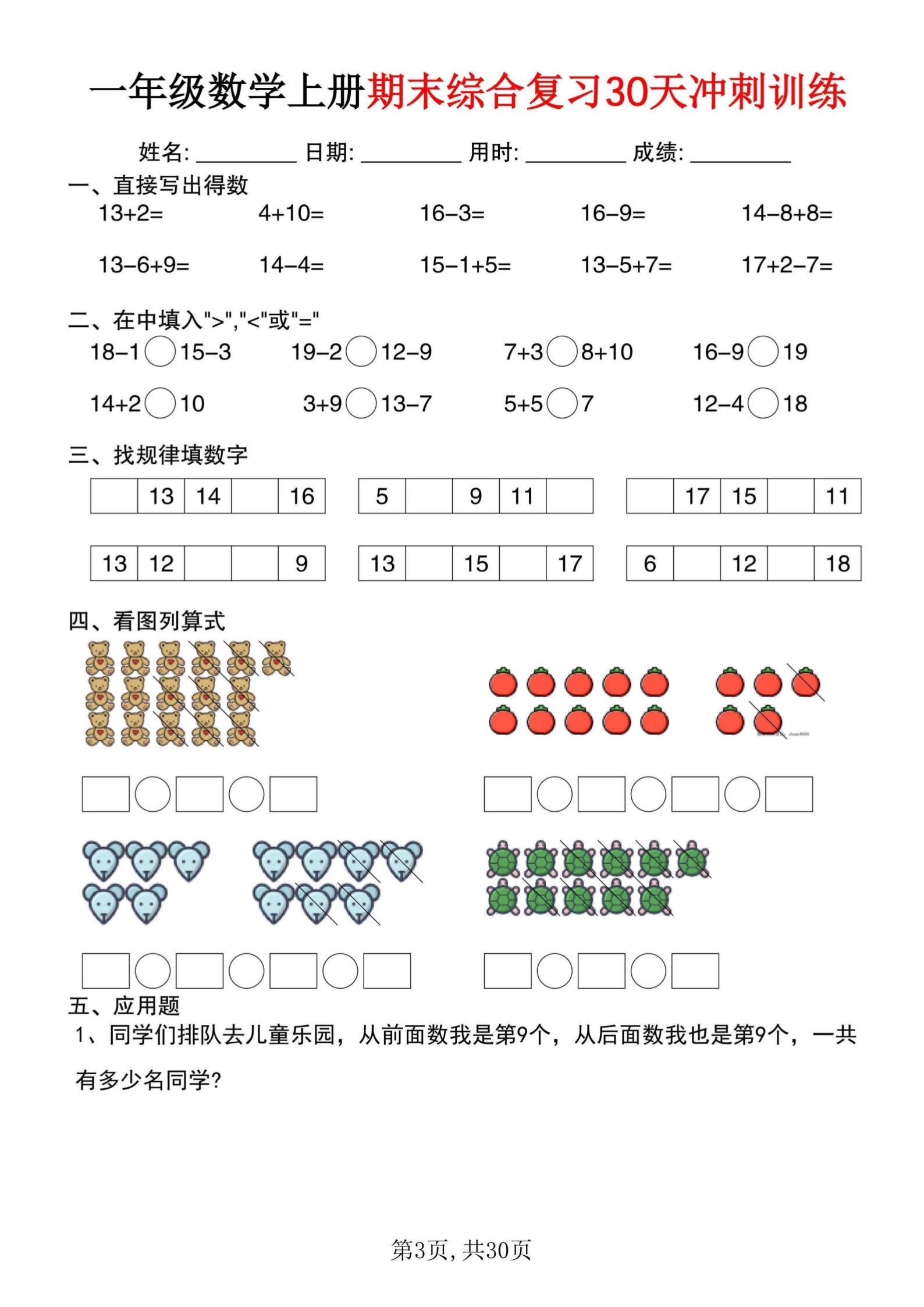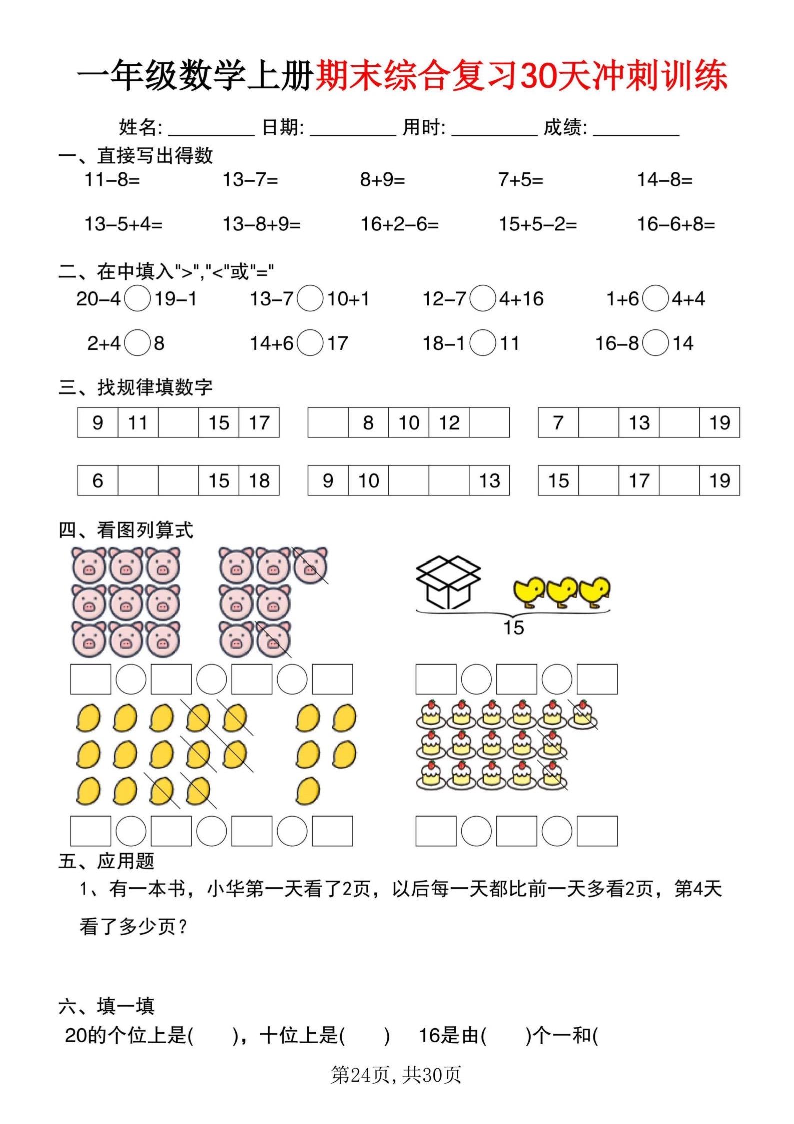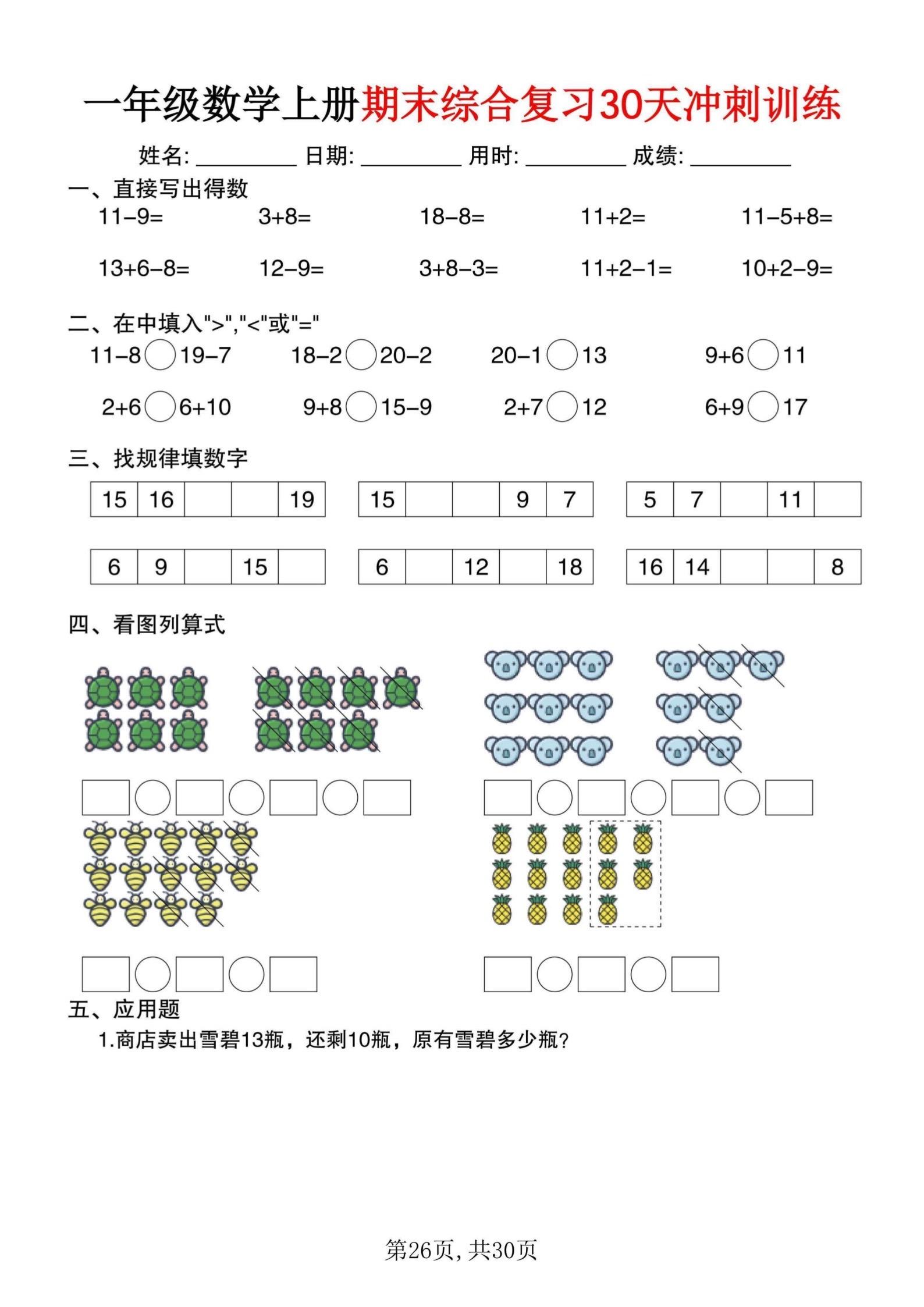 一年级上册数学期末冲刺练习。学习辅导资料 期末复习 必考考点 今日分享 每天跟我涨知识 有需要可以自行下载打印
