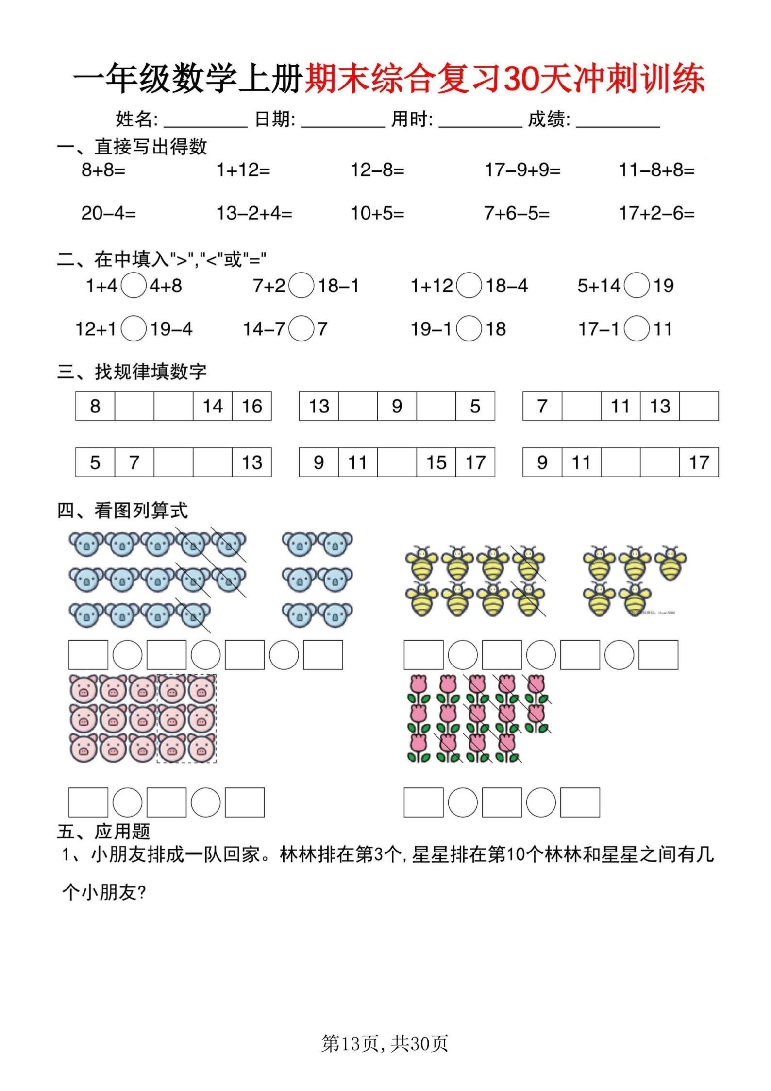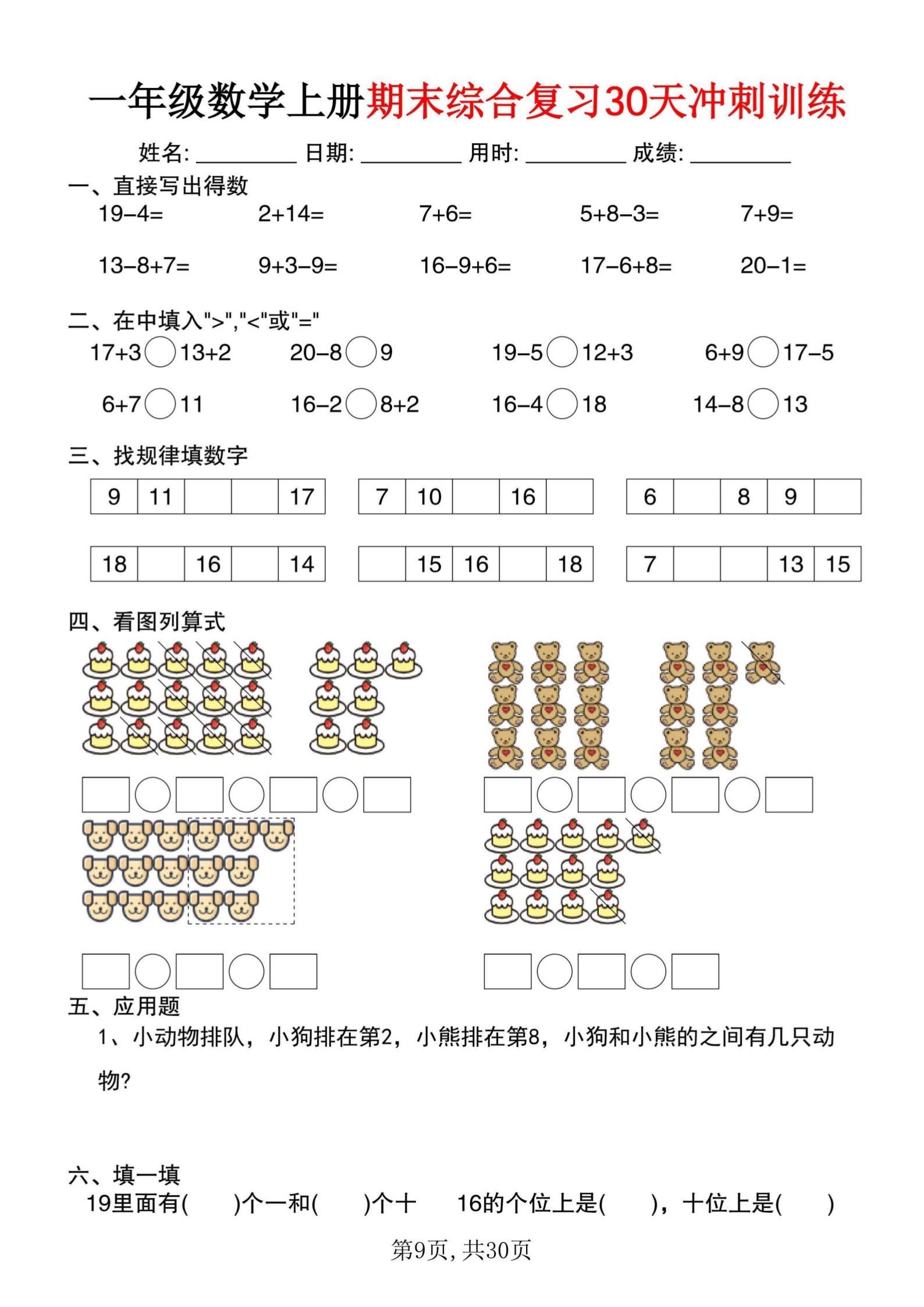 一年级上册数学期末冲刺练习。 有需要可以自行下载打印