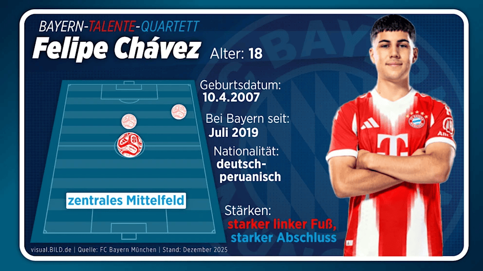 这位父亲是秘鲁人、母亲是德国人的儿子,长期以来一直是拜仁慕尼黑队中最杰出的年轻射手之一:在2024/25赛季,他代表U19青年队和拜仁二队在各项赛事中贡献了18粒进球和13次助攻。