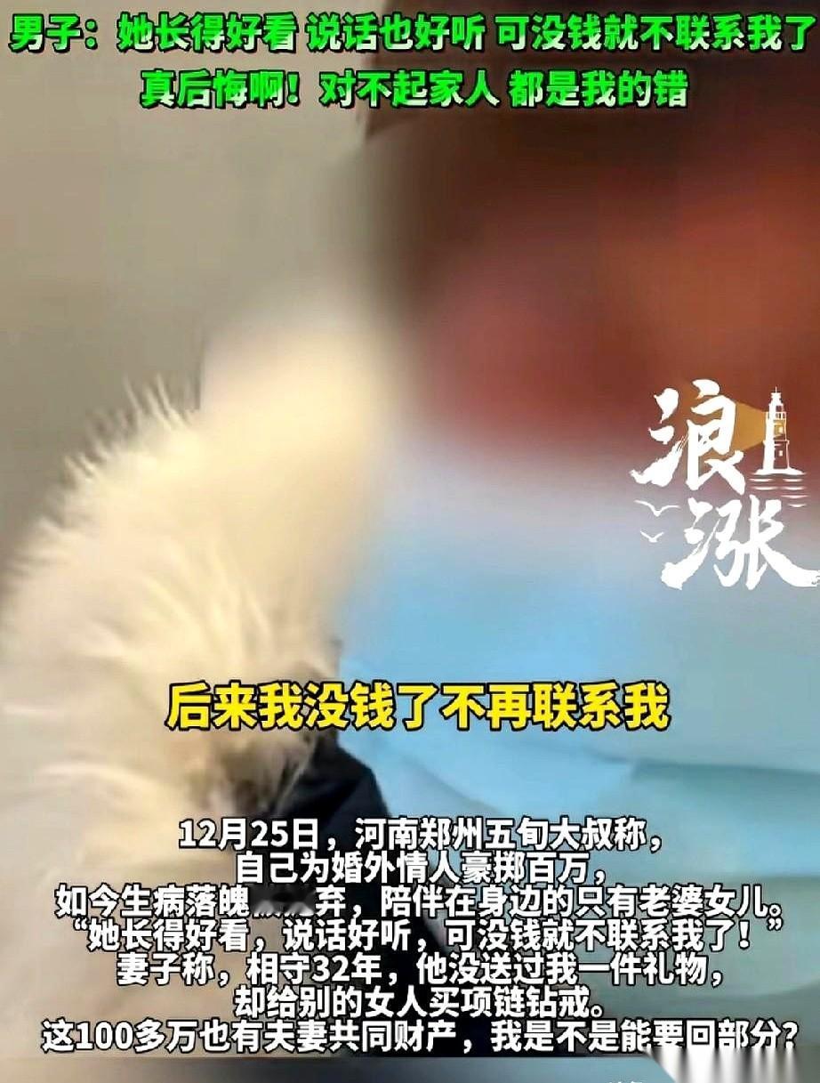 他说他后悔了。 我呸。 他要是现在还龙精虎猛、钱包鼓鼓,你看他后不后悔。 后悔的不是伤了老婆的心,后悔的是这笔“投资”彻底打了水漂。给小三花几百万买钻石项链的时候,那是“感情投资”,多巴胺上头,千金难买爷乐意。 怎么没想起来这是“夫妻共同财产”? 现在病了,没钱了,人老珠黄了,被人家一脚踹了,才想起家里那个32年连朵花都没收到过的“糟糠之妻”了?才想起要用法律武器追回“共同财产”了? 早干嘛去了。 别说什么“她长得好看,说话好听,把我迷惑了”,成年人,哥们儿,装什么纯情小白兔。说白了不就是你觉得自己的下半生,配得上更年轻的肉体和更动听的谎言么。 你赌了一把,赌输了而已。 最可悲的是谁?是那个还在床边削苹果的女人。她可能真的以为,浪子回头了。 其实他不是回头了,他是没别的路可走了。