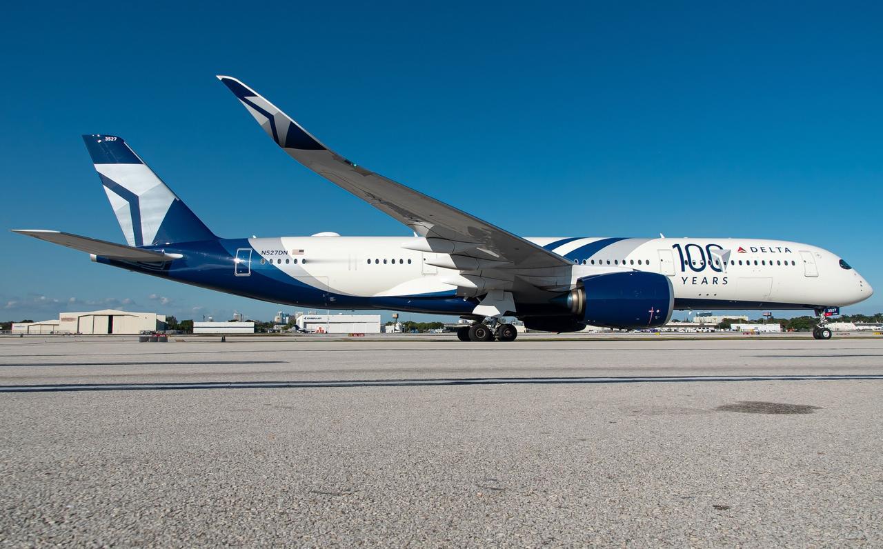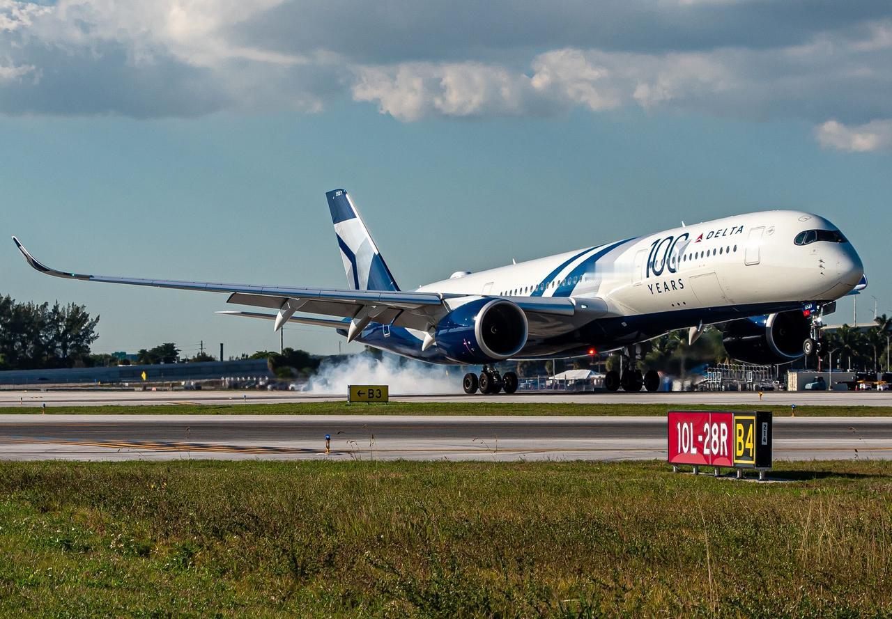 近日,达美航空派出一架百年纪念涂装的飞机前往劳德代尔堡国际机场,迎接美国橄榄球联