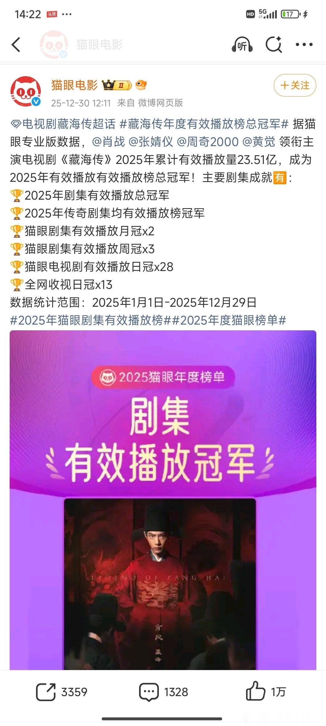 藏海传年度有效播放榜总冠军 猫眼今天再发战报猫眼专业版数据,肖战领衔主演电视剧《藏海传》2025年累计有效播放量23.51亿,成为2025年有效播放有效播放榜总冠军!主要剧集成就🈶:🏆2025年剧集有效播放总冠军🏆2025年传奇剧集均有效播放榜冠军🏆猫眼剧集有效播放月冠x2🏆猫眼剧集有效播放周冠x3🏆猫眼电视剧有效播放日冠x28🏆全网收视日冠x13数据统计范围:2025年1月1日-2025年12月29日2025年猫眼剧集有效播放榜2025年度猫眼榜单