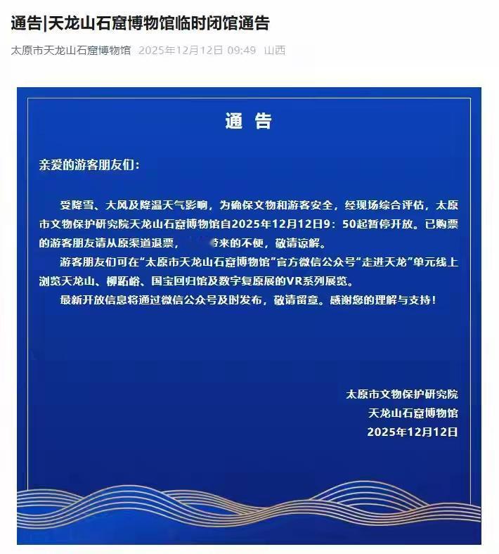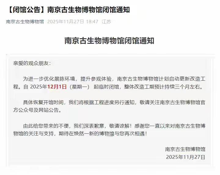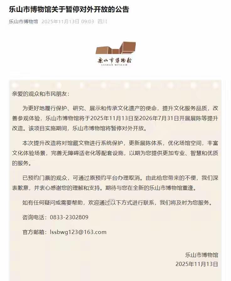 多家热门博物馆集中闭馆,究竟是何原因?背后又隐藏着怎样的秘密? 大象新闻记者核实发现,闭馆原因主要集中在三大类。展陈升级与设施维修是最普遍的,比如成都金沙遗址博物馆闭馆长达1年4个月,只为进行综合提升工程;乐山市博物馆也闭馆近9个月,只为呈现更优质展览。还有不少博物馆选择“短期休整”,如南京古生物博物馆闭馆三个月更新改造,重庆市涪陵区博物馆则闭馆推进文物预防性保护项目。此外,天气因素也成了闭馆的“导火索”,受降雪、大风等影响,部分博物馆不得不暂时闭馆。当然,也有部分博物馆的闭馆属于“常规操作”,如保利艺术博物馆元旦假期闭馆三天进行装修。这场集中闭馆,并非“打烊”,而是博物馆提质升级的决心,为了以更好的面貌和更丰富的展陈回归。博物馆困局