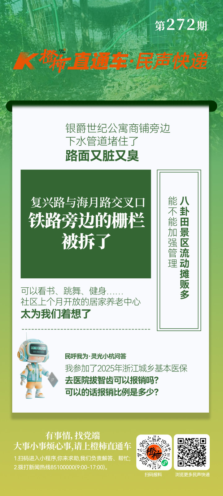 “12345”政务服务热线与“橙柿互动”联合打造的“民呼我为·灵光小杭”智能问政系统已正式上线。打开橙柿互动App,点击首页中的“灵光小杭”卡通小图(上图),即可进入“民呼我为·灵光小杭”问答页面,在对话框中输入问题,“灵光小杭”将第一时间给出权威答复。
