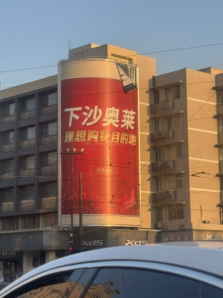这个广告牌的一个角掉下来了