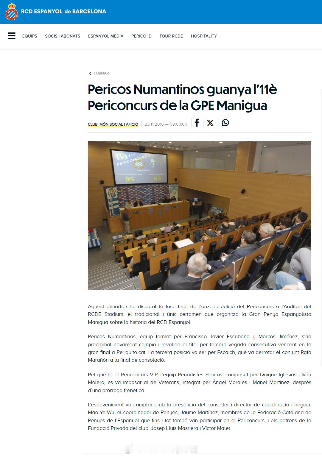 留洋-球会 马尼瓜大西班牙人球迷会马尼瓜大西班牙人球迷会(Gran Penya Espanyolista Manigua)是现存最古老的球迷团体之一,至今有70年的历史。20世纪初期,西班牙人的主场萨里亚球场(1923至1997年的主场)四周被茂密的植被和高大的棕榈树环绕,与当时市区内光秃秃的尘土球场形成鲜明对比,因此被戏称像是被扔进了“Manigua”(古巴丛林)里。因此,球迷会以“马尼瓜(Manigua)”为名并延续至今,这不仅是对社区起源的致敬,更是对萨里亚球场那段黄金岁月的深情守护。马尼瓜大西班牙人球迷会曾历经内部纷争和流离失所,但一直没有放弃组建青少年梯队,参加当地正式联赛,历史上至少有过三名中国(华人)球员在此效力。另外,他们也为老球迷们讲述故事,维系情感提供了一个平台。相比靠聚餐联络球迷感情,马尼瓜最引以为傲是创办了Periconcurs活动——西班牙人知识竞赛,参赛者需要回答关于俱乐部历史、数据、球员传记等方面的刁钻问题。在媒体聚光灯长期偏向同城死敌的环境下,西班牙人队的历史往往容易被边缘化。马尼瓜球迷会通过这种方式,迫使年轻一代球迷去翻阅档案,去记住那些在1929年夺得国王杯的英雄。因为记住历史,是一种对抗遗忘的方式,对于一家百年历史的俱乐部更是如此。相关阅读:球迷会俱乐部简介 网页链接 网页链接五冠巴萨球迷会 网页链接安格拉巴萨球迷会 网页链接