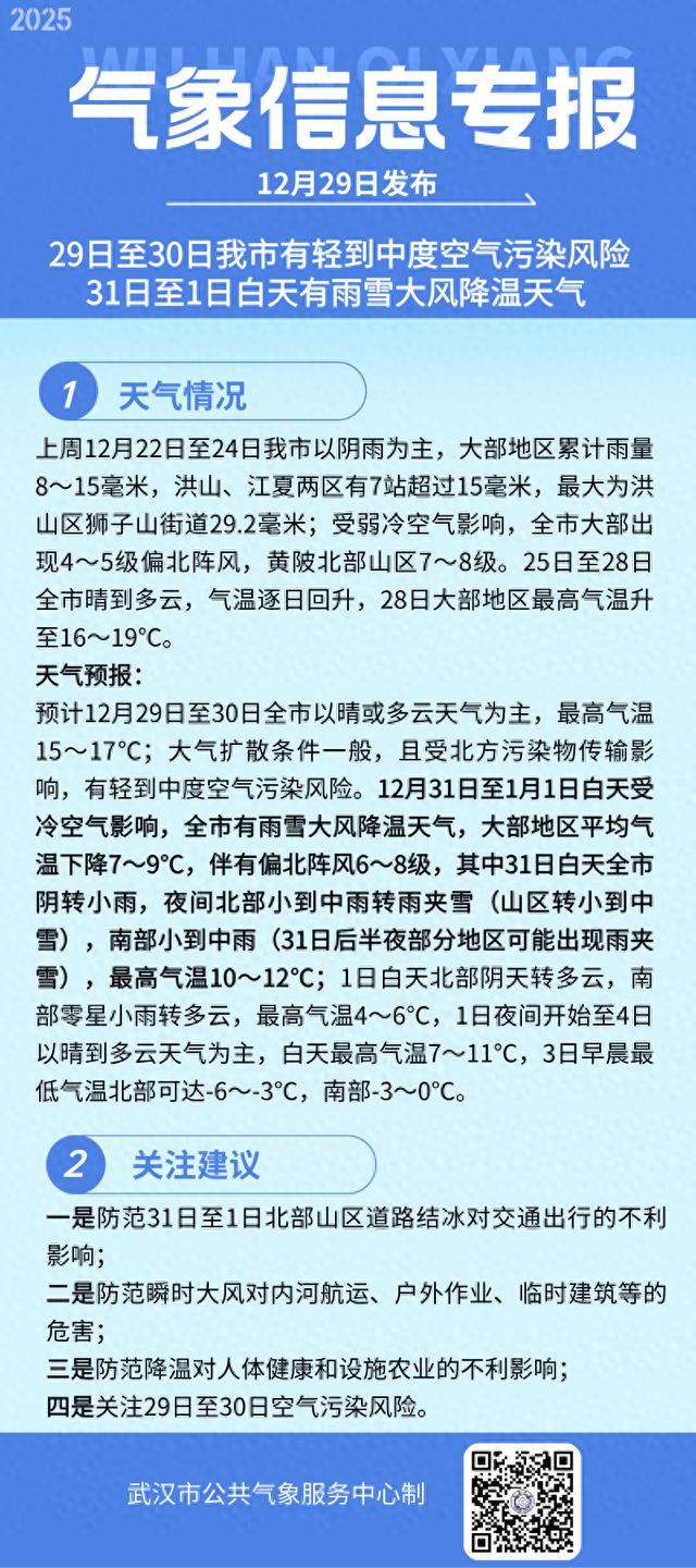 好在这种状况不会持续太久。31日白天至2026年元旦,武汉有一次大风降温雨雪天气过程,大部地区平均气温下降7~9℃,伴有偏北阵风6—8级,大气扩散条件好转,31日上午起空气质量有望明显改善。