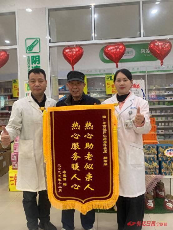 怀化日报全媒体讯近日,寒意渐浓,但在怀化市老百姓怀仁药房怀铁店内,却洋溢着别样的温暖。市民冷建国老人将一面写有“热心助老似亲人,服务周到暖人心”字样的锦旗,亲手送到了店员手中,用最质朴、最真诚的方式,表达了对该店员工长期以来热心周到服务的衷心感谢。