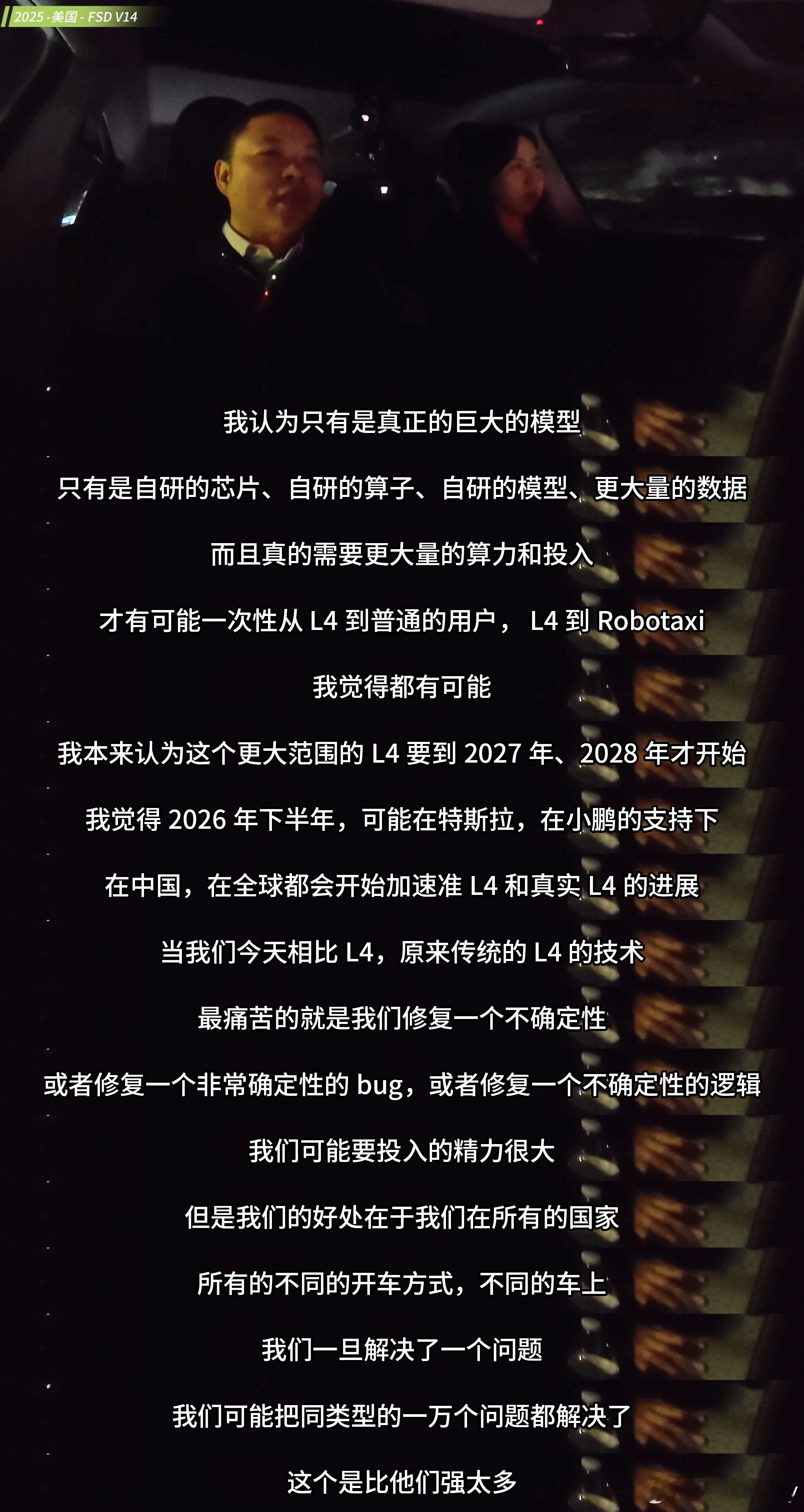 12月,何小鹏再度赴美实测特斯拉FSD,坦言FSD V14已展现出接近L4的能力