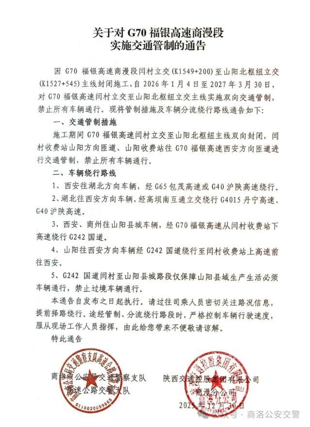 今天(12月30日),商洛市公安局交通警察支队高速公路交警大队、陕西交通控股集团有限公司商漫分公司发布通告,因G70福银高速商漫段闫村立交(K1549+200)至山阳北枢纽立交(K1527+545)主线封闭施工,自2026年1月4日至2027年3月30日,对G70福银高速闫村立交至山阳北枢纽立交主线实施双向交通管制,禁止所有车辆通行。具体如下: