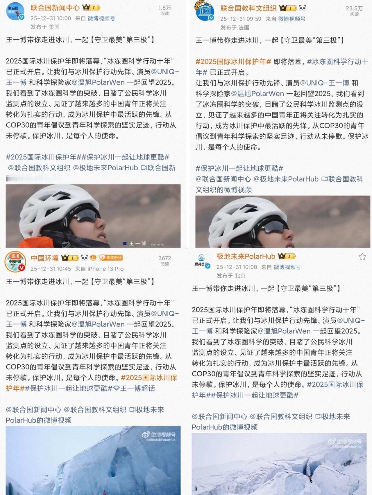 冰川保护行动先锋、演员、歌手王一博带你走进冰川,一起【守卫最美“第三极”】! 王一博再度登上联合国新闻,真正随着专业科考队伍登上海拔5300米的冰川、亲手参与安装检测点、钻取冰芯,爬上绝壁冰川的内娱唯一的王一博。 “我会慢慢感觉到,这些雪山真的是有生命的,发自内心的想要去保护它。” 真正心有大爱见过天地辽阔对大自然抱有敬畏心的人,才会有真正“心痛”的感觉,“我觉得很心痛,我们应该去做些什么才能够保护冰川”。 “让流量配得上正能量”,努力活出生命的极致,王一博为当下青年人树立了一个热烈的的充满阳光热爱蓬勃向上的正能量榜样。 王一博 王一博为保护冰川发声